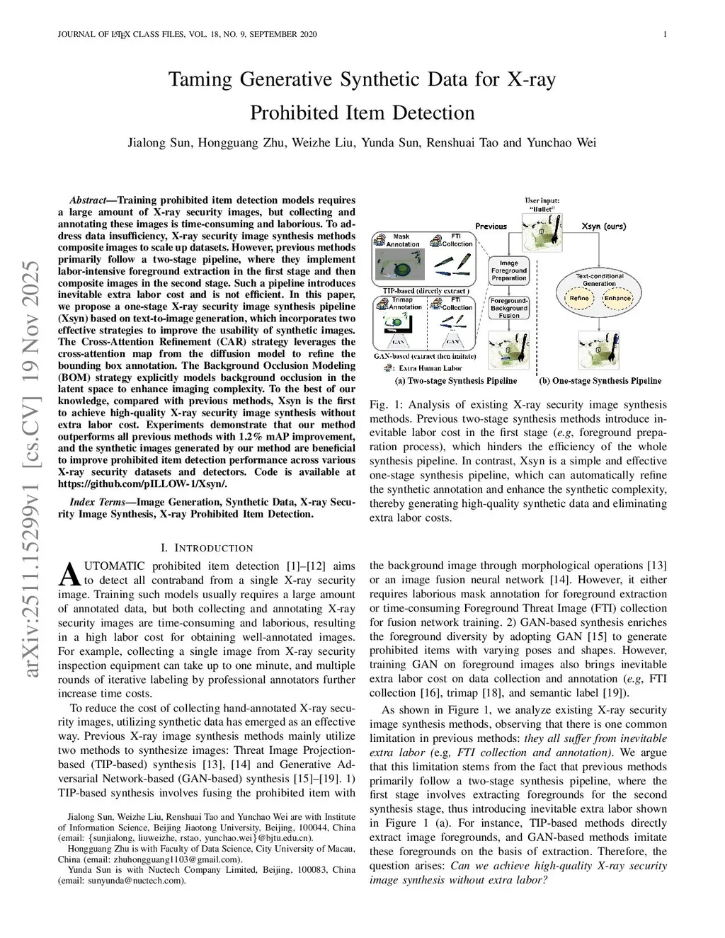 Training prohibited item detection models requires a large amount of X-ray security images, but collecting and annotating these images is time-consuming and laborious. To address data insufficiency, X-ray security image synthesis methods composite images to scale up datasets. However, previous methods primarily follow a two-stage pipeline, where they implement labor-intensive foreground extraction in the first stage and then composite images in the second stage. Such a pipeline introduces inevitable extra labor cost and is not efficient. In this paper, we propose a one-stage X-ray security image synthesis pipeline (Xsyn) based on text-to-image generation, which incorporates two effective strategies to improve the usability of synthetic images. The Cross-Attention Refinement (CAR) strategy leverages the cross-attention map from the diffusion model to refine the bounding box annotation. The Background Occlusion Modeling (BOM) strategy explicitly models background occlusion in the latent space to enhance imaging complexity. To the best of our knowledge, compared with previous methods, Xsyn is the first to achieve high-quality X-ray security image synthesis without extra labor cost. Experiments demonstrate that our method outperforms all previous methods with 1.2% mAP improvement, and the synthetic images generated by our method are beneficial to improve prohibited item detection performance across various X-ray security datasets and detectors. Code is available atthis https URL.