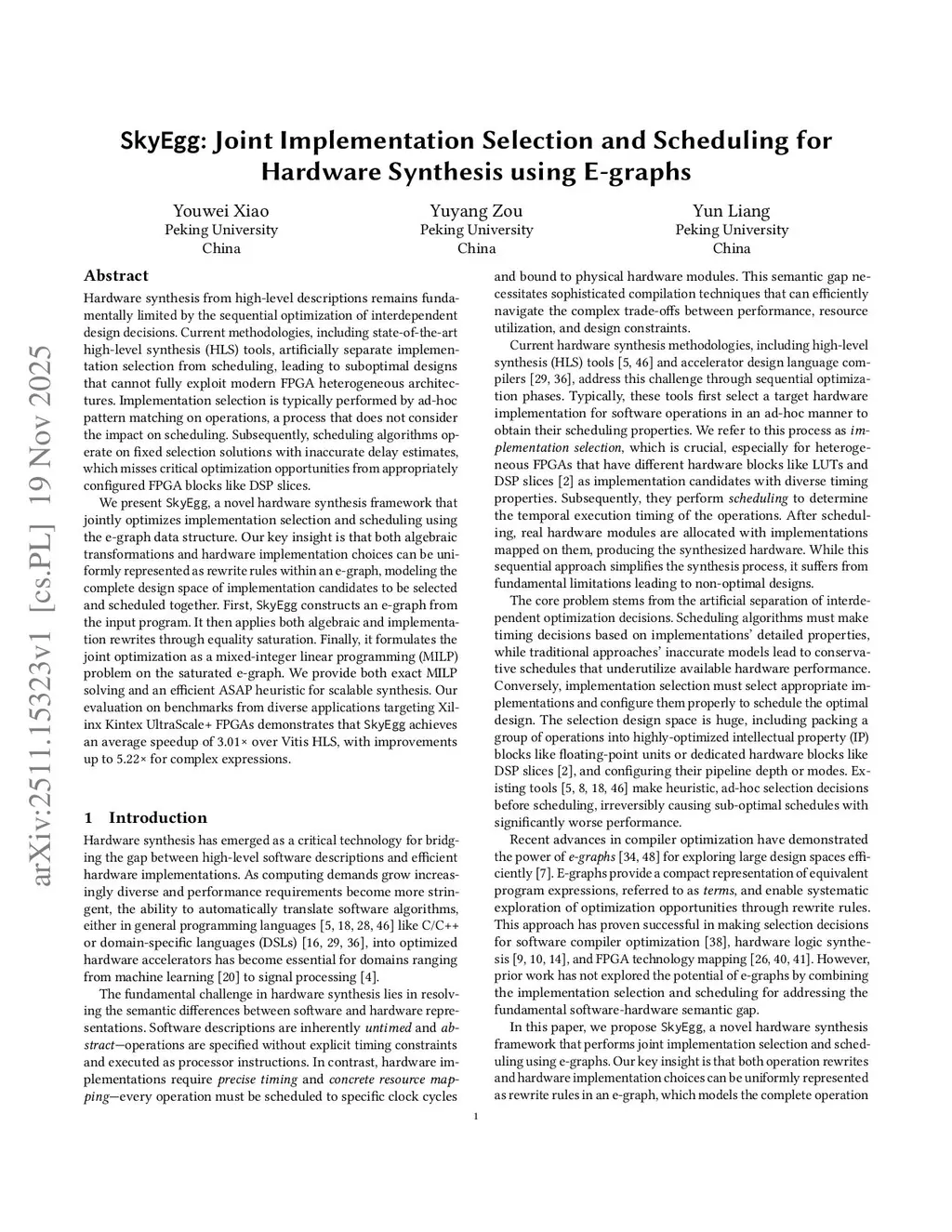 Hardware synthesis from high-level descriptions remains fundamentally limited by the sequential optimization of interdependent design decisions. Current methodologies, including state-of-the-art high-level synthesis (HLS) tools, artificially separate implementation selection from scheduling, leading to suboptimal designs that cannot fully exploit modern FPGA heterogeneous architectures. Implementation selection is typically performed by ad-hoc pattern matching on operations, a process that does not consider the impact on scheduling. Subsequently, scheduling algorithms operate on fixed selection solutions with inaccurate delay estimates, which misses critical optimization opportunities from appropriately configured FPGA blocks like DSP slices.We present SkyEgg, a novel hardware synthesis framework that jointly optimizes implementation selection and scheduling using the e-graph data structure. Our key insight is that both algebraic transformations and hardware implementation choices can be uniformly represented as rewrite rules within an e-graph, modeling the complete design space of implementation candidates to be selected and scheduled together. First, SkyEgg constructs an e-graph from the input program. It then applies both algebraic and implementation rewrites through equality saturation. Finally, it formulates the joint optimization as a mixed-integer linear programming (MILP) problem on the saturated e-graph. We provide both exact MILP solving and an efficient ASAP heuristic for scalable synthesis. Our evaluation on benchmarks from diverse applications targeting Xilinx Kintex UltraScale+ FPGAs demonstrates that SkyEgg achieves an average speedup of 3.01x over Vitis HLS, with improvements up to 5.22x for complex expressions.