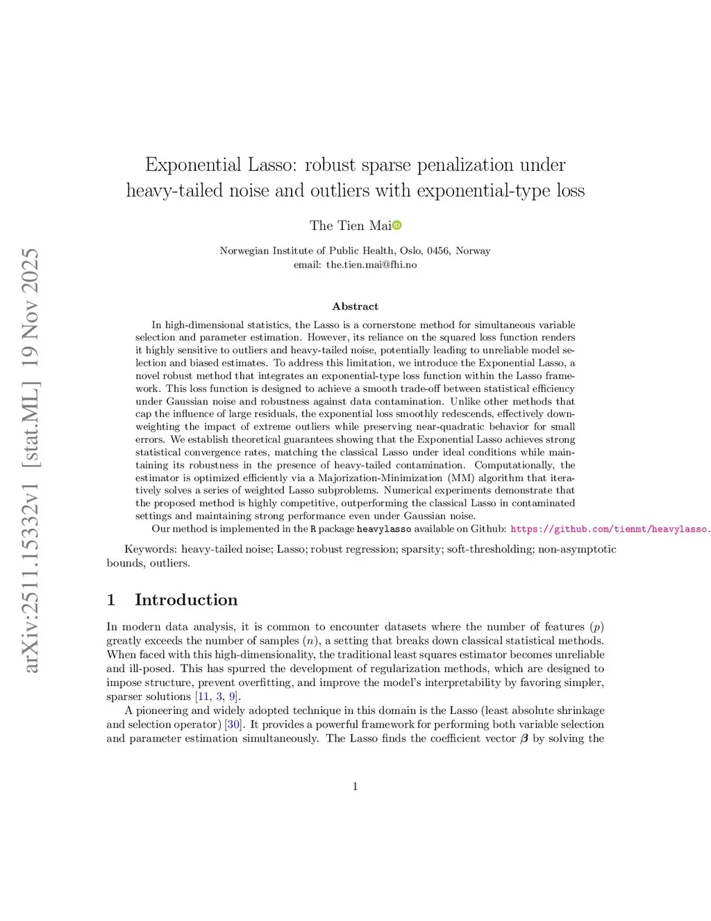 In high-dimensional statistics, the Lasso is a cornerstone method for simultaneous variable selection and parameter estimation. However, its reliance on the squared loss function renders it highly sensitive to outliers and heavy-tailed noise, potentially leading to unreliable model selection and biased estimates. To address this limitation, we introduce the Exponential Lasso, a novel robust method that integrates an exponential-type loss function within the Lasso framework. This loss function is designed to achieve a smooth trade-off between statistical efficiency under Gaussian noise and robustness against data contamination. Unlike other methods that cap the influence of large residuals, the exponential loss smoothly redescends, effectively downweighting the impact of extreme outliers while preserving near-quadratic behavior for small errors. We establish theoretical guarantees showing that the Exponential Lasso achieves strong statistical convergence rates, matching the classical Lasso under ideal conditions while maintaining its robustness in the presence of heavy-tailed contamination. Computationally, the estimator is optimized efficiently via a Majorization-Minimization (MM) algorithm that iteratively solves a series of weighted Lasso subproblems. Numerical experiments demonstrate that the proposed method is highly competitive, outperforming the classical Lasso in contaminated settings and maintaining strong performance even under Gaussian noise.Our method is implemented in the \texttt{R} package \texttt{heavylasso} available on Github:this https URL