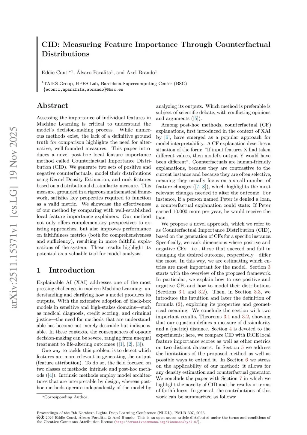 Assessing the importance of individual features in Machine Learning is critical to understand the model's decision-making process. While numerous methods exist, the lack of a definitive ground truth for comparison highlights the need for alternative, well-founded measures. This paper introduces a novel post-hoc local feature importance method called Counterfactual Importance Distribution (CID). We generate two sets of positive and negative counterfactuals, model their distributions using Kernel Density Estimation, and rank features based on a distributional dissimilarity measure. This measure, grounded in a rigorous mathematical framework, satisfies key properties required to function as a valid metric. We showcase the effectiveness of our method by comparing with well-established local feature importance explainers. Our method not only offers complementary perspectives to existing approaches, but also improves performance on faithfulness metrics (both for comprehensiveness and sufficiency), resulting in more faithful explanations of the system. These results highlight its potential as a valuable tool for model analysis.