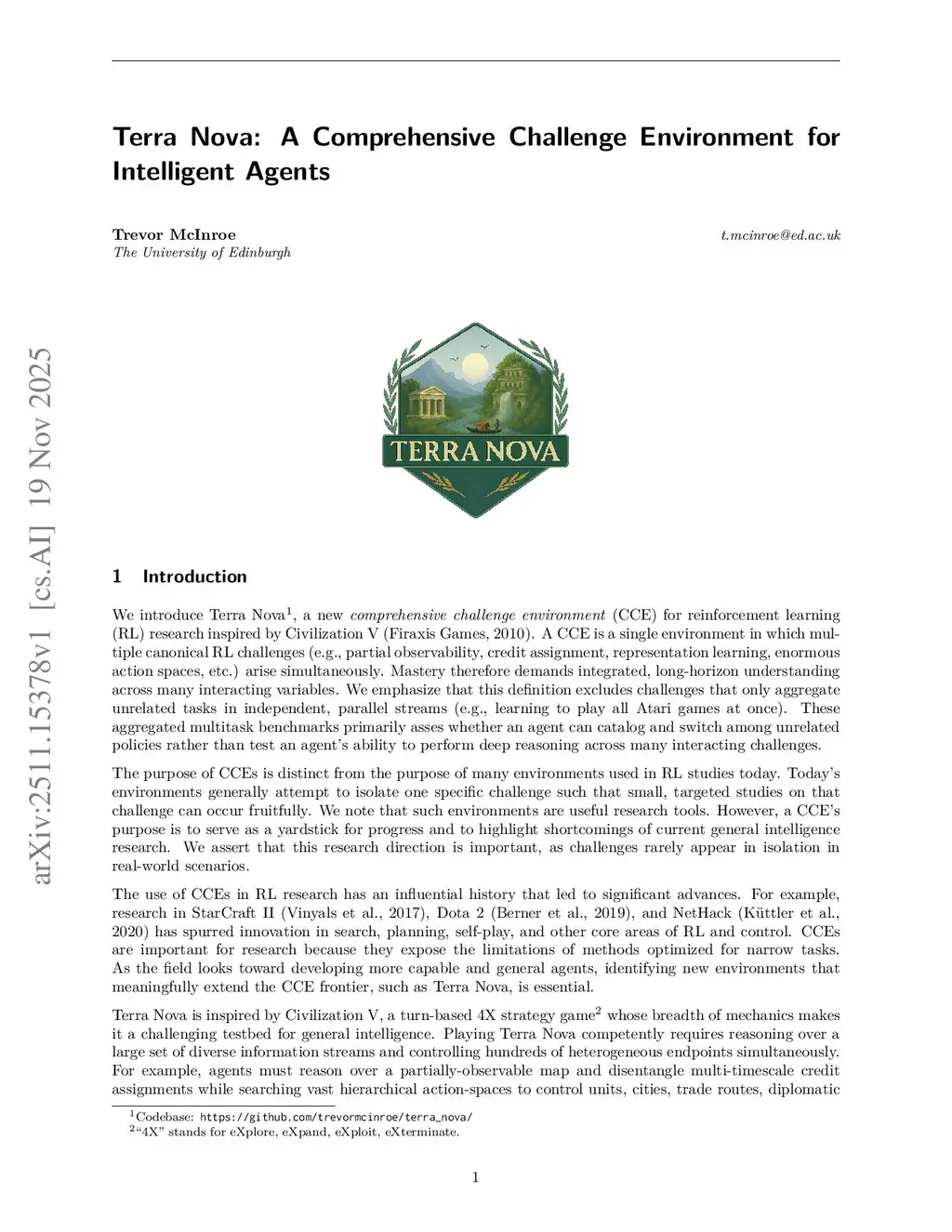 We introduce Terra Nova, a new comprehensive challenge environment (CCE) for reinforcement learning (RL) research inspired by Civilization V. A CCE is a single environment in which multiple canonical RL challenges (e.g., partial observability, credit assignment, representation learning, enormous action spaces, etc.) arise simultaneously. Mastery therefore demands integrated, long-horizon understanding across many interacting variables. We emphasize that this definition excludes challenges that only aggregate unrelated tasks in independent, parallel streams (e.g., learning to play all Atari games at once). These aggregated multitask benchmarks primarily asses whether an agent can catalog and switch among unrelated policies rather than test an agent's ability to perform deep reasoning across many interacting challenges.