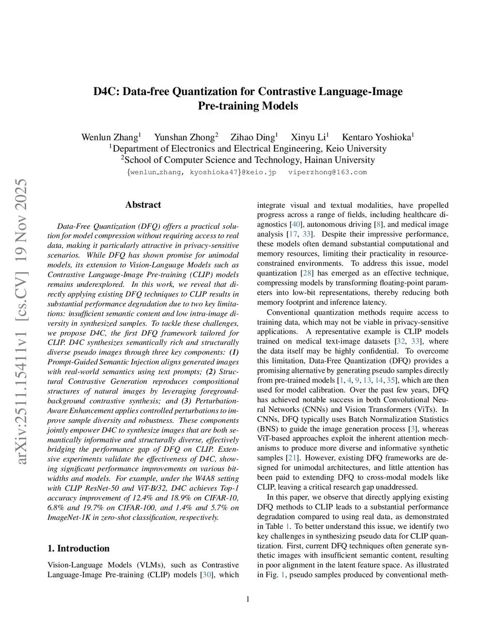 Data-Free Quantization (DFQ) offers a practical solution for model compression without requiring access to real data, making it particularly attractive in privacy-sensitive scenarios. While DFQ has shown promise for unimodal models, its extension to Vision-Language Models such as Contrastive Language-Image Pre-training (CLIP) models remains underexplored. In this work, we reveal that directly applying existing DFQ techniques to CLIP results in substantial performance degradation due to two key limitations: insufficient semantic content and low intra-image diversity in synthesized samples. To tackle these challenges, we propose D4C, the first DFQ framework tailored for CLIP. D4C synthesizes semantically rich and structurally diverse pseudo images through three key components: (1) Prompt-Guided Semantic Injection aligns generated images with real-world semantics using text prompts; (2) Structural Contrastive Generation reproduces compositional structures of natural images by leveraging foreground-background contrastive synthesis; and (3) Perturbation-Aware Enhancement applies controlled perturbations to improve sample diversity and robustness. These components jointly empower D4C to synthesize images that are both semantically informative and structurally diverse, effectively bridging the performance gap of DFQ on CLIP. Extensive experiments validate the effectiveness of D4C, showing significant performance improvements on various bit-widths and models. For example, under the W4A8 setting with CLIP ResNet-50 and ViT-B/32, D4C achieves Top-1 accuracy improvement of 12.4% and 18.9% on CIFAR-10, 6.8% and 19.7% on CIFAR-100, and 1.4% and 5.7% on ImageNet-1K in zero-shot classification, respectively.