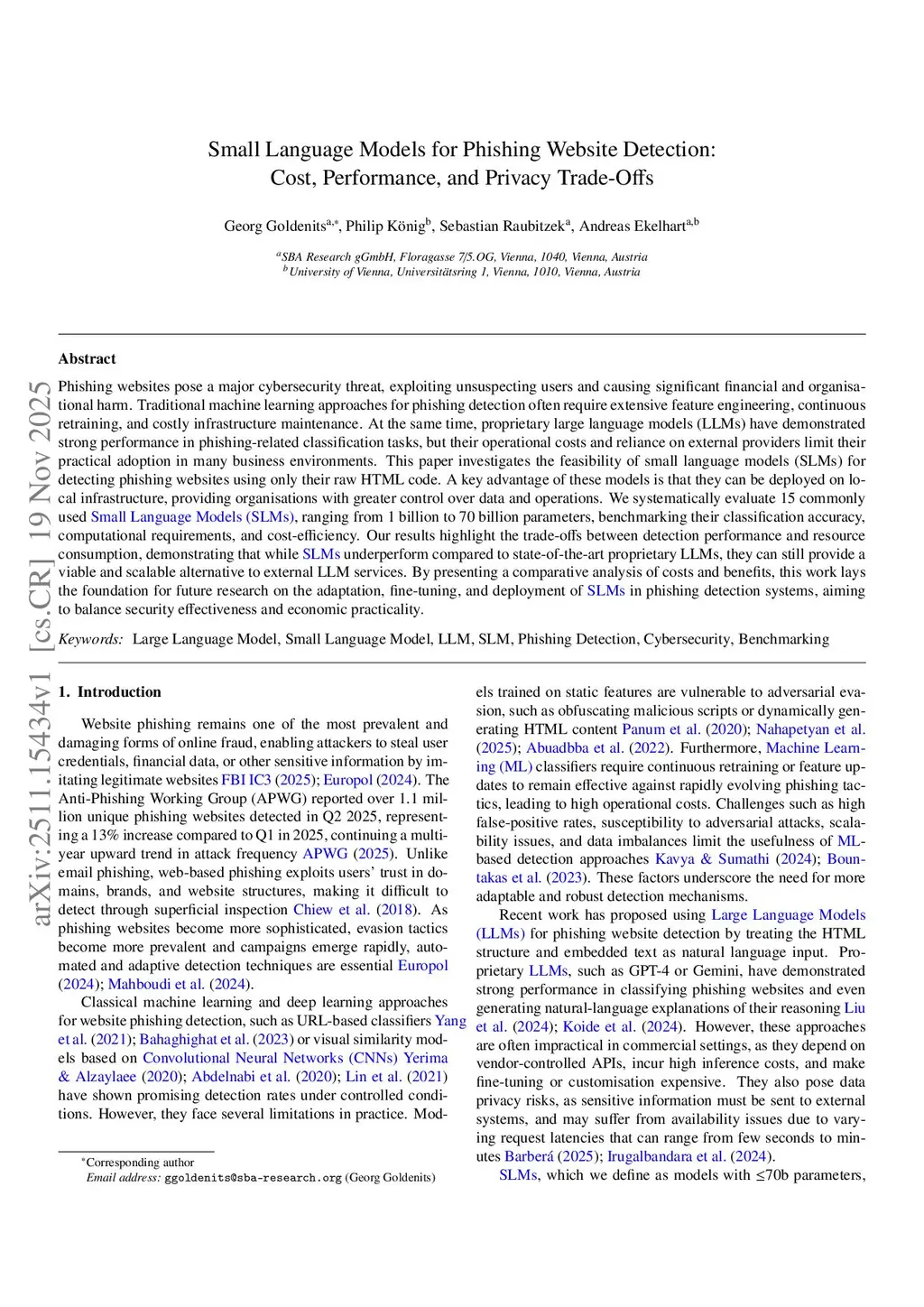 Phishing websites pose a major cybersecurity threat, exploiting unsuspecting users and causing significant financial and organisational harm. Traditional machine learning approaches for phishing detection often require extensive feature engineering, continuous retraining, and costly infrastructure maintenance. At the same time, proprietary large language models (LLMs) have demonstrated strong performance in phishing-related classification tasks, but their operational costs and reliance on external providers limit their practical adoption in many business environments. This paper investigates the feasibility of small language models (SLMs) for detecting phishing websites using only their raw HTML code. A key advantage of these models is that they can be deployed on local infrastructure, providing organisations with greater control over data and operations. We systematically evaluate 15 commonly used Small Language Models (SLMs), ranging from 1 billion to 70 billion parameters, benchmarking their classification accuracy, computational requirements, and cost-efficiency. Our results highlight the trade-offs between detection performance and resource consumption, demonstrating that while SLMs underperform compared to state-of-the-art proprietary LLMs, they can still provide a viable and scalable alternative to external LLM services. By presenting a comparative analysis of costs and benefits, this work lays the foundation for future research on the adaptation, fine-tuning, and deployment of SLMs in phishing detection systems, aiming to balance security effectiveness and economic practicality.