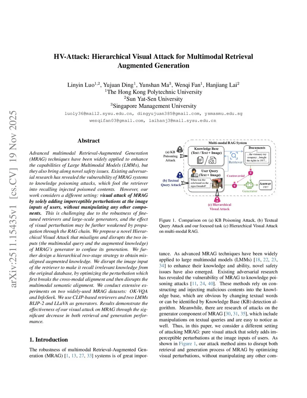 HV-Attack: Hierarchical Visual Attack for Multimodal Retrieval Augmented Generation