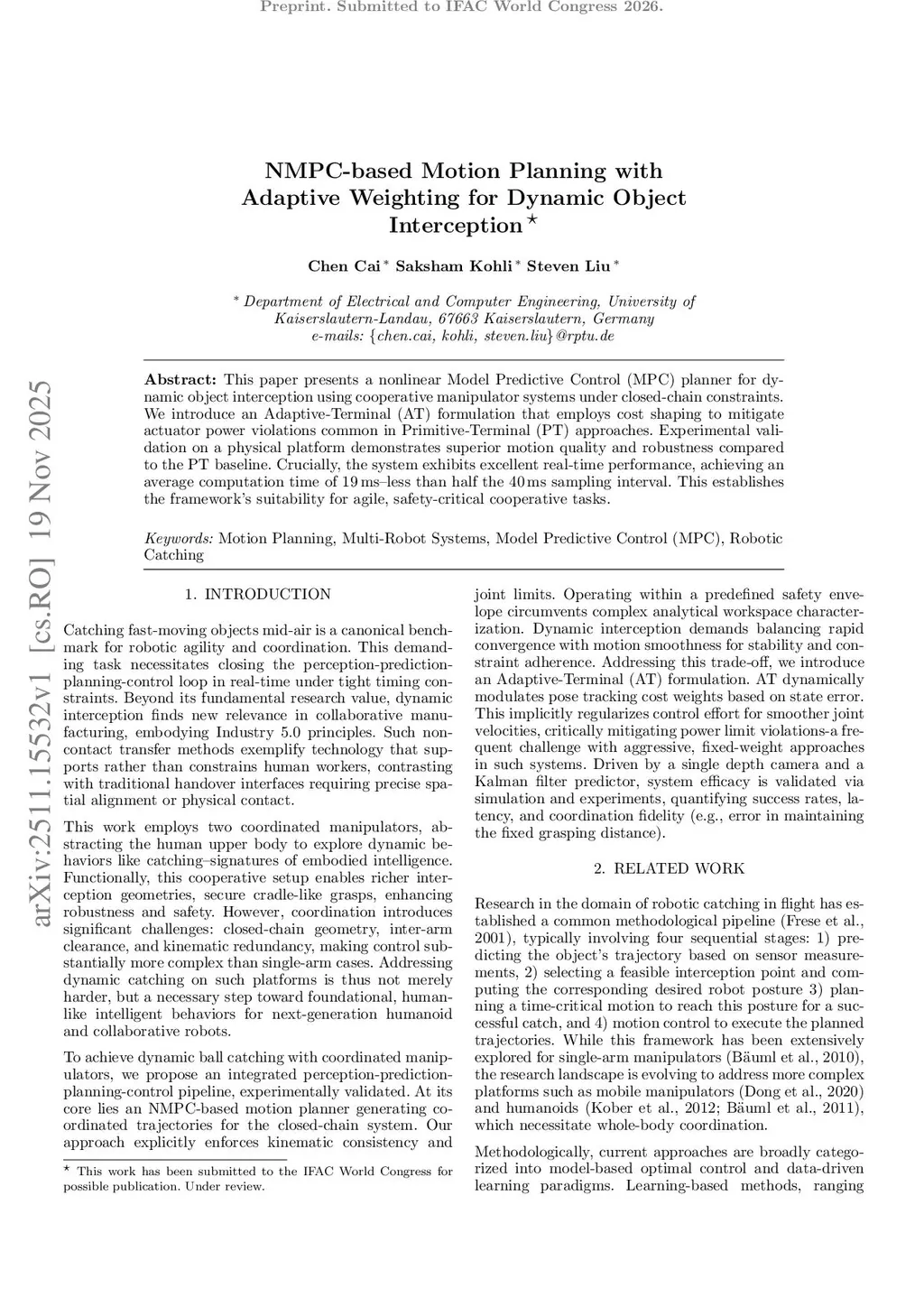 Catching fast-moving objects serves as a benchmark for robotic agility, posing significant coordination challenges for cooperative manipulator systems holding a catcher, particularly due to inherent closed-chain constraints. This paper presents a nonlinear model predictive control (MPC)-based motion planner that bridges high-level interception planning with real-time joint space control, enabling dynamic object interception for systems comprising two cooperating arms. We introduce an Adaptive- Terminal (AT) MPC formulation featuring cost shaping, which contrasts with a simpler Primitive-Terminal (PT) approach relying heavily on terminal penalties for rapid convergence. The proposed AT formulation is shown to effectively mitigate issues related to actuator power limit violations frequently encountered with the PT strategy, yielding trajectories and significantly reduced control effort. Experimental results on a robotic platform with two cooperative arms, demonstrating excellent real time performance, with an average planner cycle computation time of approximately 19 ms-less than half the 40 ms system sampling time. These results indicate that the AT formulation achieves significantly improved motion quality and robustness with minimal computational overhead compared to the PT baseline, making it well-suited for dynamic, cooperative interception tasks.