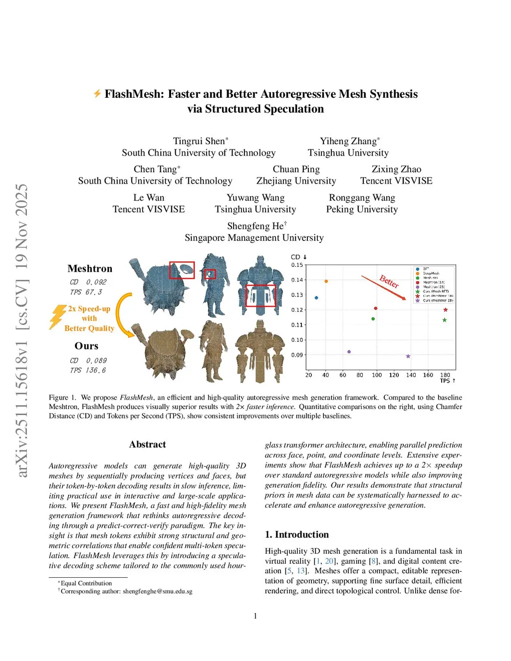 Autoregressive models can generate high-quality 3D meshes by sequentially producing vertices and faces, but their token-by-token decoding results in slow inference, limiting practical use in interactive and large-scale applications. We present FlashMesh, a fast and high-fidelity mesh generation framework that rethinks autoregressive decoding through a predict-correct-verify paradigm. The key insight is that mesh tokens exhibit strong structural and geometric correlations that enable confident multi-token speculation. FlashMesh leverages this by introducing a speculative decoding scheme tailored to the commonly used hourglass transformer architecture, enabling parallel prediction across face, point, and coordinate levels. Extensive experiments show that FlashMesh achieves up to a 2 x speedup over standard autoregressive models while also improving generation fidelity. Our results demonstrate that structural priors in mesh data can be systematically harnessed to accelerate and enhance autoregressive generation.