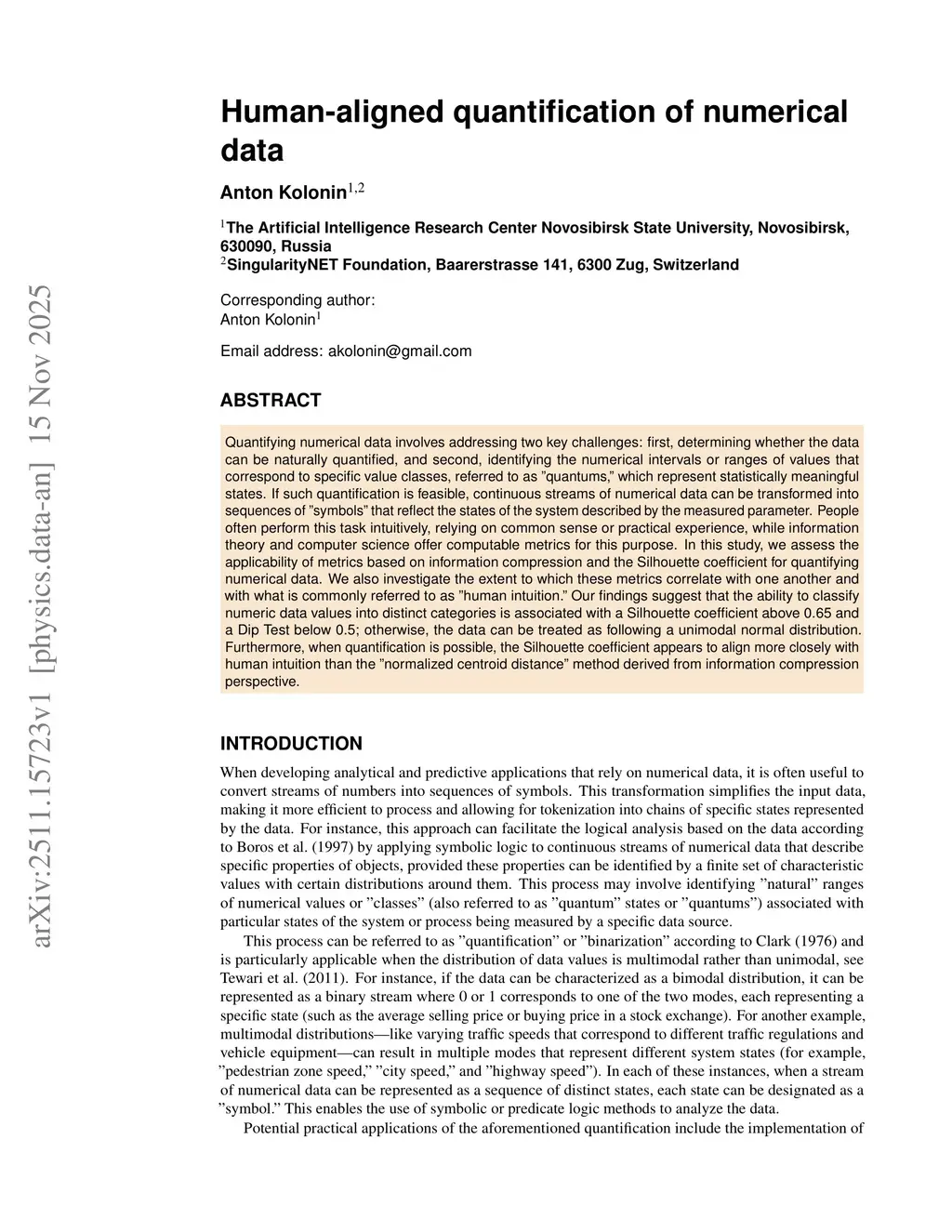 Quantifying numerical data involves addressing two key challenges: first, determining whether the data can be naturally quantified, and second, identifying the numerical intervals or ranges of values that correspond to specific value classes, referred to as "quantums," which represent statistically meaningful states. If such quantification is feasible, continuous streams of numerical data can be transformed into sequences of "symbols" that reflect the states of the system described by the measured parameter. People often perform this task intuitively, relying on common sense or practical experience, while information theory and computer science offer computable metrics for this purpose. In this study, we assess the applicability of metrics based on information compression and the Silhouette coefficient for quantifying numerical data. We also investigate the extent to which these metrics correlate with one another and with what is commonly referred to as "human intuition." Our findings suggest that the ability to classify numeric data values into distinct categories is associated with a Silhouette coefficient above 0.65 and a Dip Test below 0.5; otherwise, the data can be treated as following a unimodal normal distribution. Furthermore, when quantification is possible, the Silhouette coefficient appears to align more closely with human intuition than the "normalized centroid distance" method derived from information compression perspective.