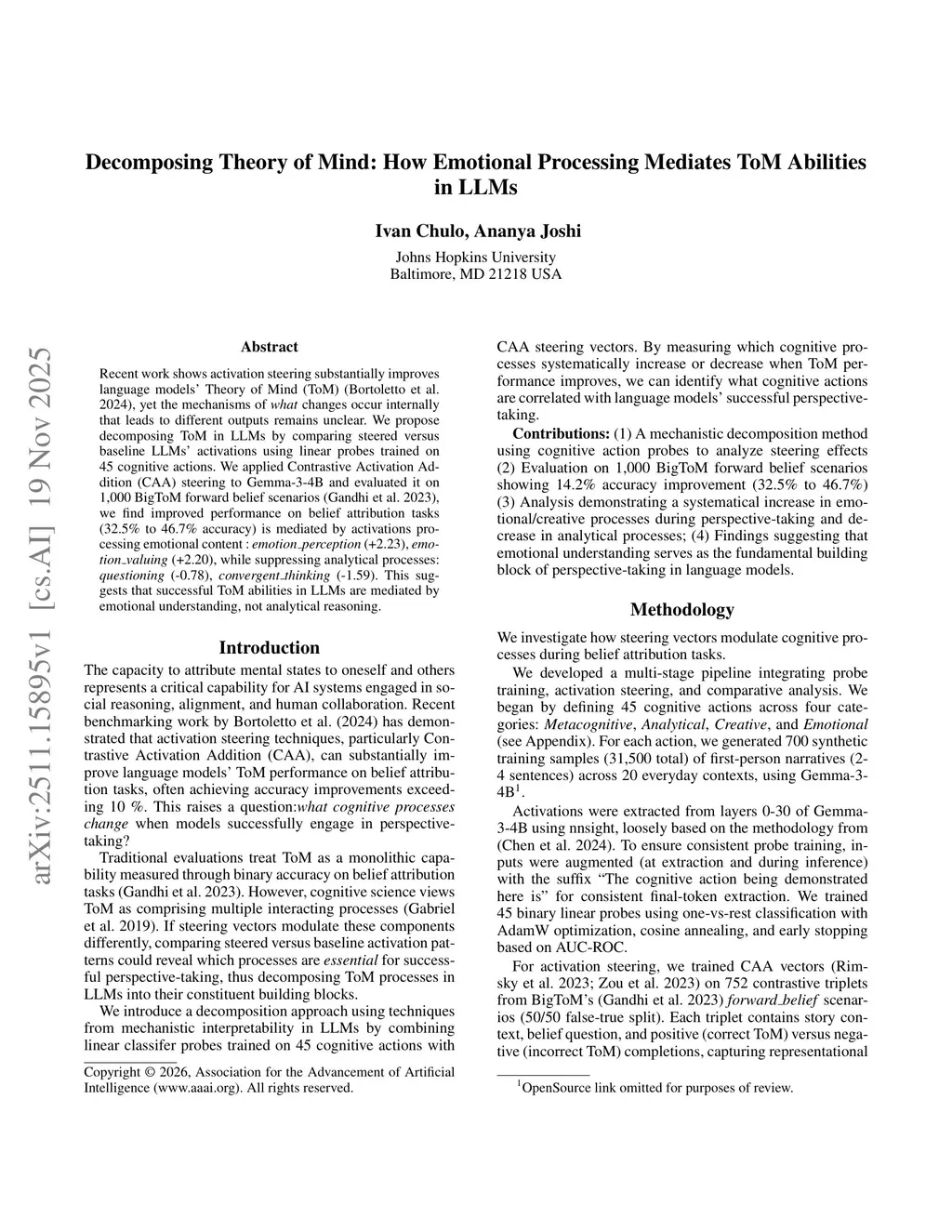 Recent work shows activation steering substantially improves language models' Theory of Mind (ToM) (Bortoletto et al. 2024), yet the mechanisms of what changes occur internally that leads to different outputs remains unclear. We propose decomposing ToM in LLMs by comparing steered versus baseline LLMs' activations using linear probes trained on 45 cognitive actions. We applied Contrastive Activation Addition (CAA) steering to Gemma-3-4B and evaluated it on 1,000 BigToM forward belief scenarios (Gandhi et al. 2023), we find improved performance on belief attribution tasks (32.5\% to 46.7\% accuracy) is mediated by activations processing emotional content : emotion perception (+2.23), emotion valuing (+2.20), while suppressing analytical processes: questioning (-0.78), convergent thinking (-1.59). This suggests that successful ToM abilities in LLMs are mediated by emotional understanding, not analytical reasoning.