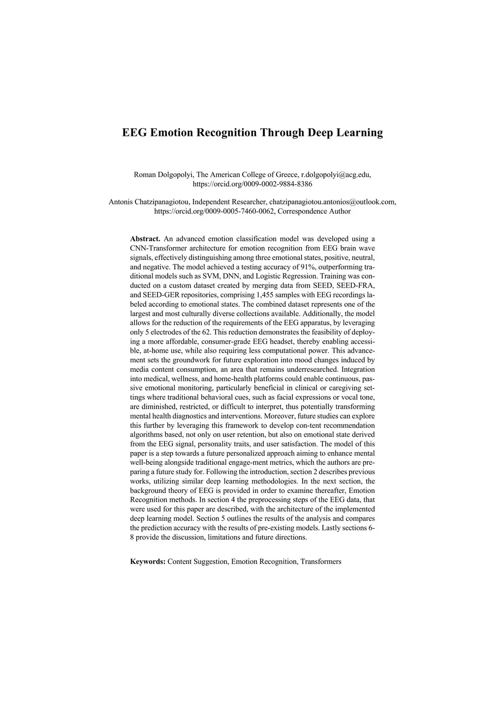 An advanced emotion classification model was developed using a CNN-Transformer architecture for emotion recognition from EEG brain wave signals, effectively distinguishing among three emotional states, positive, neutral and negative. The model achieved a testing accuracy of 91%, outperforming traditional models such as SVM, DNN, and Logistic Regression. Training was conducted on a custom dataset created by merging data from SEED, SEED-FRA, and SEED-GER repositories, comprising 1,455 samples with EEG recordings labeled according to emotional states. The combined dataset represents one of the largest and most culturally diverse collections available. Additionally, the model allows for the reduction of the requirements of the EEG apparatus, by leveraging only 5 electrodes of the 62. This reduction demonstrates the feasibility of deploying a more affordable consumer-grade EEG headset, thereby enabling accessible, at-home use, while also requiring less computational power. This advancement sets the groundwork for future exploration into mood changes induced by media content consumption, an area that remains underresearched. Integration into medical, wellness, and home-health platforms could enable continuous, passive emotional monitoring, particularly beneficial in clinical or caregiving settings where traditional behavioral cues, such as facial expressions or vocal tone, are diminished, restricted, or difficult to interpret, thus potentially transforming mental health diagnostics and interventions...