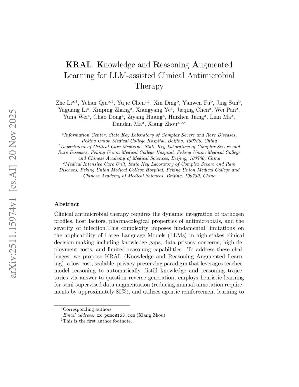Clinical antimicrobial therapy requires the dynamic integration of pathogen profiles, host factors, pharmacological properties of antimicrobials, and the severity of this http URL complexity imposes fundamental limitations on the applicability of Large Language Models (LLMs) in high-stakes clinical decision-making including knowledge gaps, data privacy concerns, high deployment costs, and limited reasoning capabilities. To address these challenges, we propose KRAL (Knowledge and Reasoning Augmented Learning), a low-cost, scalable, privacy-preserving paradigm that leverages teacher-model reasoning to automatically distill knowledge and reasoning trajectories via answer-to-question reverse generation, employs heuristic learning for semi-supervised data augmentation (reducing manual annotation requirements by approximately 80%), and utilizes agentic reinforcement learning to jointly enhance medical knowledge and reasoning while optimizing computational and memory efficiency. A hierarchical evaluation employing diverse teacher-model proxies reduces assessment costs, while modular interface design facilitates seamless system updates. Experimental results demonstrate that KRAL significantly outperforms traditional Retrieval-Augmented Generation (RAG) and Supervised Fine-Tuning (SFT) methods. It improves knowledge question-answering capability (Accuracy@1 on the external open-source benchmark MEDQA increased by 1.8% vs. SFT and 3.6% vs. RAG) and reasoning capability (Pass@1 on the external benchmark PUMCH Antimicrobial increased by 27% vs. SFT and 27.2% vs. RAG), achieved at ~20% of SFT's long-term training costs. This establishes KRAL as an effective solution for enhancing local LLMs' clinical diagnostic capabilities, enabling low-cost, high-safety deployment in complex medical decision support.