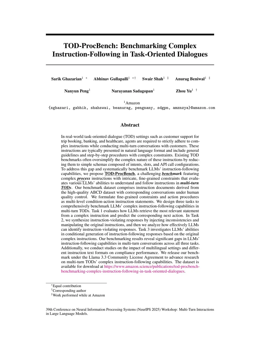 In real-world task-oriented dialogue (TOD) settings, agents are required to strictly adhere to complex instructions while conducting multi-turn conversations with customers. These instructions are typically presented in natural language format and include general guidelines and step-by-step procedures with complex constraints. Existing TOD benchmarks often oversimplify the complex nature of these instructions by reducing them to simple schemas composed of intents, slots, and API call configurations. To address this gap and systematically benchmark LLMs' instruction-following capabilities, we propose TOD-ProcBench, a challenging benchmark featuring complex process instructions with intricate, fine-grained constraints that evaluates various LLMs' abilities to understand and follow instructions in multi-turn TODs. Our benchmark dataset comprises instruction documents derived from the high-quality ABCD dataset with corresponding conversations under human quality control. We formulate fine-grained constraints and action procedures as multi-level condition-action instruction statements. We design three tasks to comprehensively benchmark LLMs' complex instruction-following capabilities in multi-turn TODs. Task 1 evaluates how LLMs retrieve the most relevant statement from a complex instruction and predict the corresponding next action. In Task 2, we synthesize instruction-violating responses by injecting inconsistencies and manipulating the original instructions, and then we analyze how effectively LLMs can identify instruction-violating responses. Task 3 investigates LLMs' abilities in conditional generation of instruction-following responses based on the original complex instructions. Additionally, we conduct studies on the impact of multilingual settings and different instruction text formats on compliance performance. We release our benchmark under the Llama 3.3 Community License Agreement.