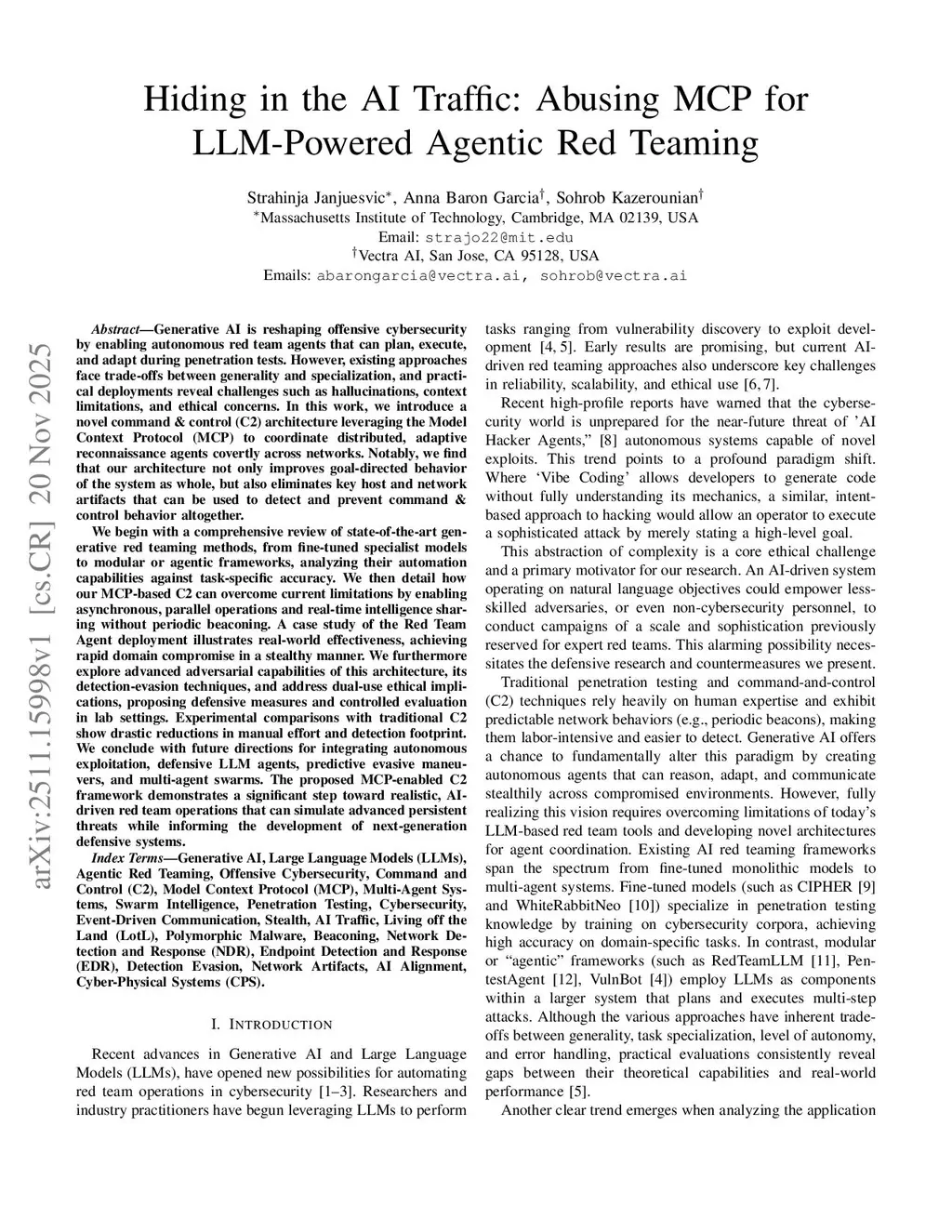 Generative AI is reshaping offensive cybersecurity by enabling autonomous red team agents that can plan, execute, and adapt during penetration tests. However, existing approaches face trade-offs between generality and specialization, and practical deployments reveal challenges such as hallucinations, context limitations, and ethical concerns. In this work, we introduce a novel command & control (C2) architecture leveraging the Model Context Protocol (MCP) to coordinate distributed, adaptive reconnaissance agents covertly across networks. Notably, we find that our architecture not only improves goal-directed behavior of the system as whole, but also eliminates key host and network artifacts that can be used to detect and prevent command & control behavior altogether. We begin with a comprehensive review of state-of-the-art generative red teaming methods, from fine-tuned specialist models to modular or agentic frameworks, analyzing their automation capabilities against task-specific accuracy. We then detail how our MCP-based C2 can overcome current limitations by enabling asynchronous, parallel operations and real-time intelligence sharing without periodic beaconing. We furthermore explore advanced adversarial capabilities of this architecture, its detection-evasion techniques, and address dual-use ethical implications, proposing defensive measures and controlled evaluation in lab settings. Experimental comparisons with traditional C2 show drastic reductions in manual effort and detection footprint. We conclude with future directions for integrating autonomous exploitation, defensive LLM agents, predictive evasive maneuvers, and multi-agent swarms. The proposed MCP-enabled C2 framework demonstrates a significant step toward realistic, AI-driven red team operations that can simulate advanced persistent threats while informing the development of next-generation defensive systems.