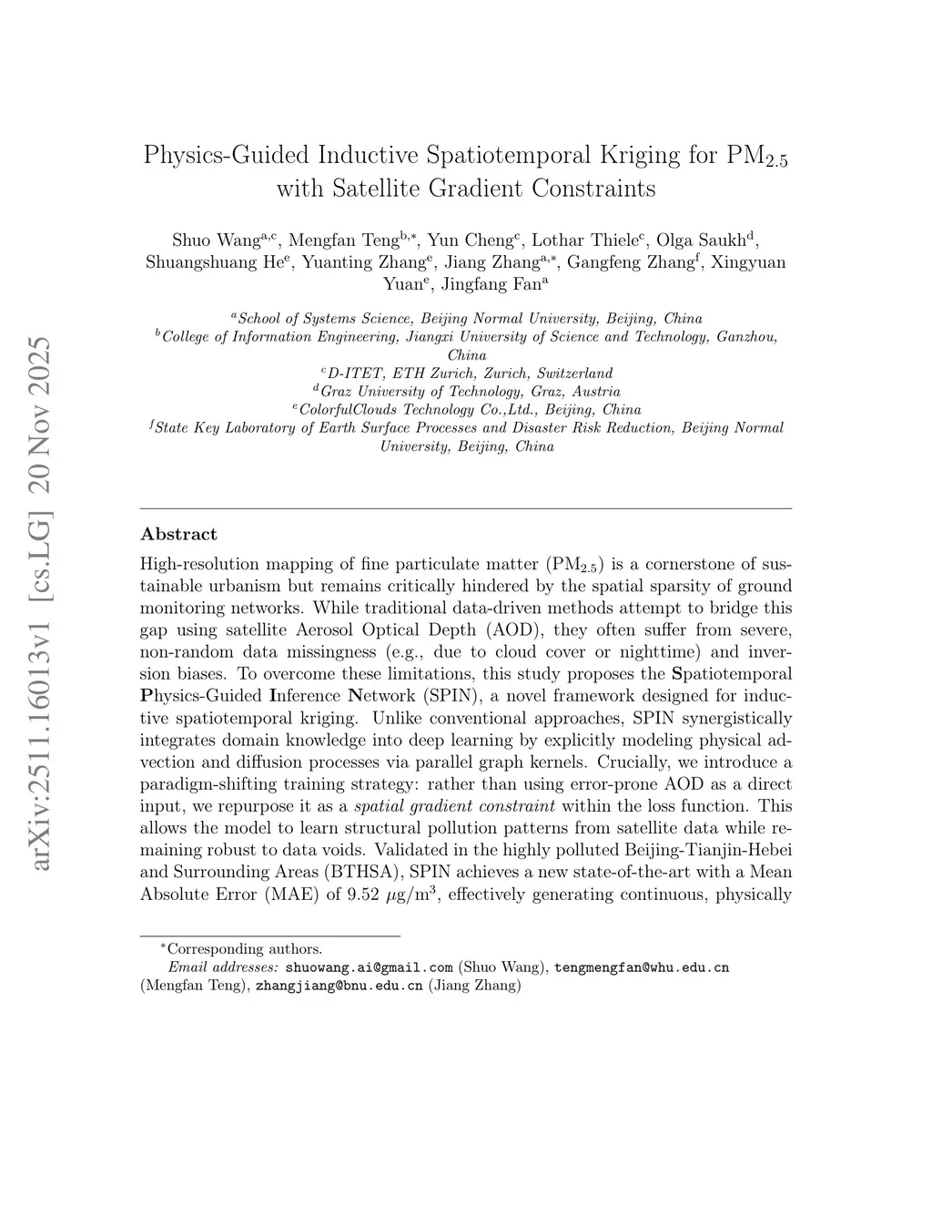 High-resolution mapping of fine particulate matter (PM2.5) is a cornerstone of sustainable urbanism but remains critically hindered by the spatial sparsity of ground monitoring networks. While traditional data-driven methods attempt to bridge this gap using satellite Aerosol Optical Depth (AOD), they often suffer from severe, non-random data missingness (e.g., due to cloud cover or nighttime) and inversion biases. To overcome these limitations, this study proposes the Spatiotemporal Physics-Guided Inference Network (SPIN), a novel framework designed for inductive spatiotemporal kriging. Unlike conventional approaches, SPIN synergistically integrates domain knowledge into deep learning by explicitly modeling physical advection and diffusion processes via parallel graph kernels. Crucially, we introduce a paradigm-shifting training strategy: rather than using error-prone AOD as a direct input, we repurpose it as a spatial gradient constraint within the loss function. This allows the model to learn structural pollution patterns from satellite data while remaining robust to data voids. Validated in the highly polluted Beijing-Tianjin-Hebei and Surrounding Areas (BTHSA), SPIN achieves a new state-of-the-art with a Mean Absolute Error (MAE) of 9.52 ug/m^3, effectively generating continuous, physically plausible pollution fields even in unmonitored areas. This work provides a robust, low-cost, and all-weather solution for fine-grained environmental management.