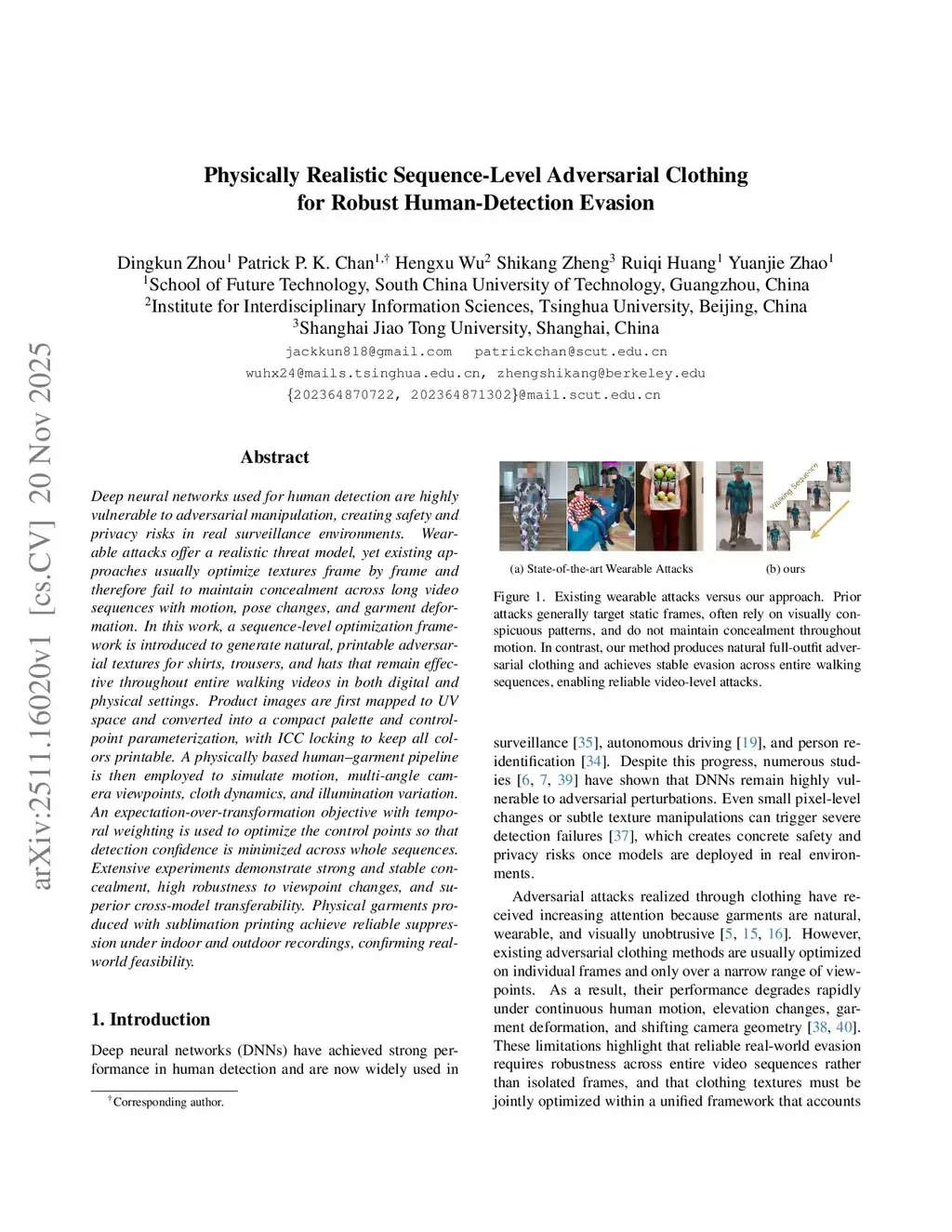 Deep neural networks used for human detection are highly vulnerable to adversarial manipulation, creating safety and privacy risks in real surveillance environments. Wearable attacks offer a realistic threat model, yet existing approaches usually optimize textures frame by frame and therefore fail to maintain concealment across long video sequences with motion, pose changes, and garment deformation. In this work, a sequence-level optimization framework is introduced to generate natural, printable adversarial textures for shirts, trousers, and hats that remain effective throughout entire walking videos in both digital and physical settings. Product images are first mapped to UV space and converted into a compact palette and control-point parameterization, with ICC locking to keep all colors printable. A physically based human-garment pipeline is then employed to simulate motion, multi-angle camera viewpoints, cloth dynamics, and illumination variation. An expectation-over-transformation objective with temporal weighting is used to optimize the control points so that detection confidence is minimized across whole sequences. Extensive experiments demonstrate strong and stable concealment, high robustness to viewpoint changes, and superior cross-model transferability. Physical garments produced with sublimation printing achieve reliable suppression under indoor and outdoor recordings, confirming real-world feasibility.