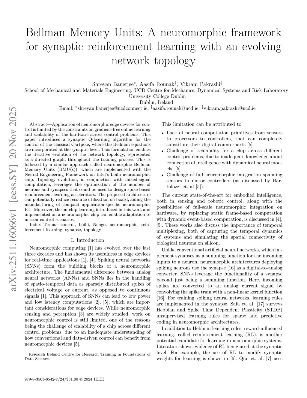 Application of neuromorphic edge devices for control is limited by the constraints on gradient-free online learning and scalability of the hardware across control problems. This paper introduces a synaptic Q-learning algorithm for the control of the classical Cartpole, where the Bellman equations are incorporated at the synaptic level. This formulation enables the iterative evolution of the network topology, represented as a directed graph, throughout the training process. This is followed by a similar approach called neuromorphic Bellman Memory Units (BMU(s)), which are implemented with the Neural Engineering Framework on Intel's Loihi neuromorphic chip. Topology evolution, in conjunction with mixed-signal computation, leverages the optimization of the number of neurons and synapses that could be used to design spike-based reinforcement learning accelerators. The proposed architecture can potentially reduce resource utilization on board, aiding the manufacturing of compact application-specific neuromorphic ICs. Moreover, the on-chip learning introduced in this work and implemented on a neuromorphic chip can enable adaptation to unseen control scenarios.