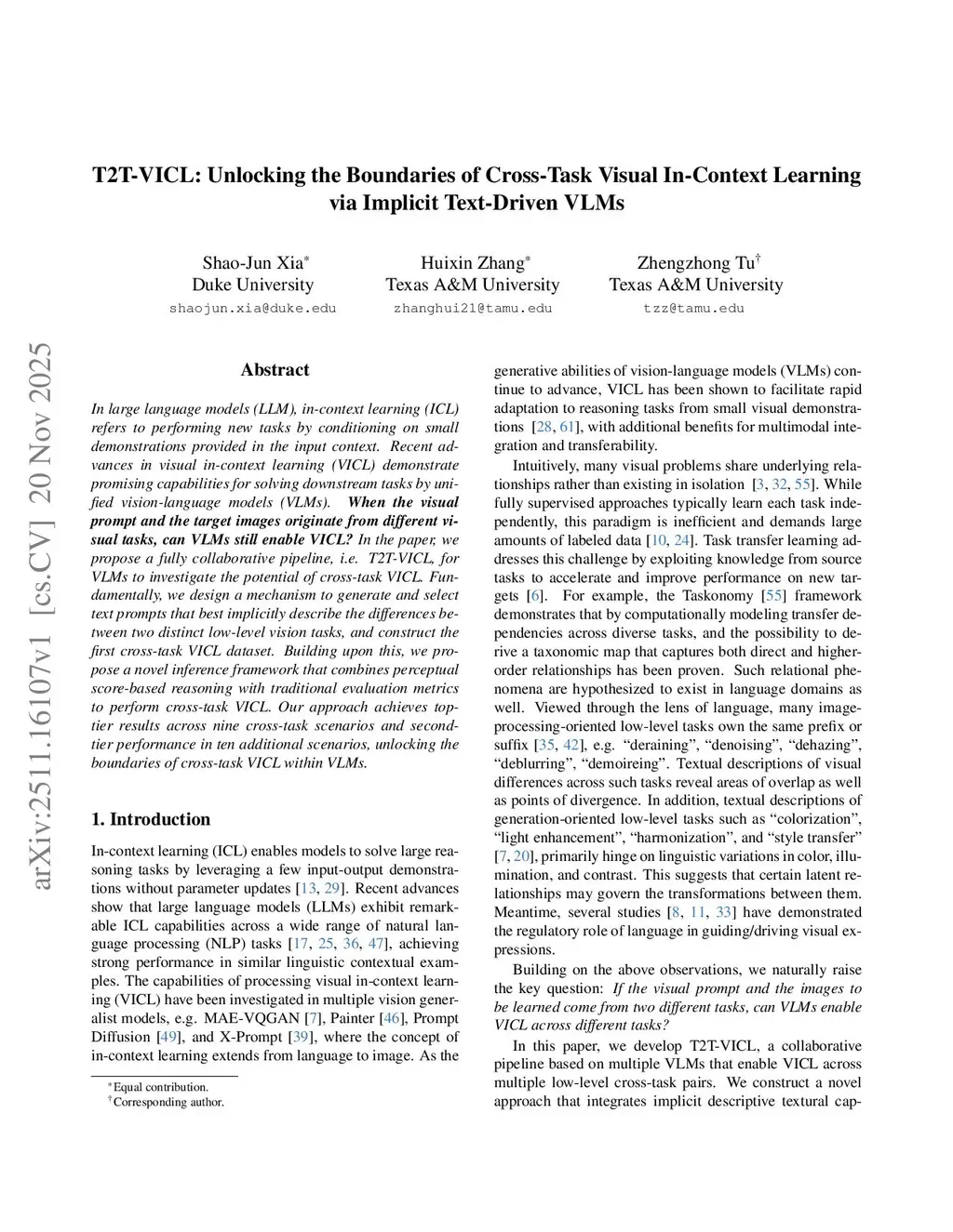 In large language models (LLM), in-context learning (ICL) refers to performing new tasks by conditioning on small demonstrations provided in the input context. Recent advances in visual in-context learning (VICL) demonstrate promising capabilities for solving downstream tasks by unified vision-language models (VLMs). When the visual prompt and the target images originate from different visual tasks, can VLMs still enable VICL? In the paper, we propose a fully collaborative pipeline, i.e. T2T-VICL, for VLMs to investigate the potential of cross-task VICL. Fundamentally, we design a mechanism to generate and select text prompts that best implicitly describe the differences between two distinct low-level vision tasks, and construct the first cross-task VICL dataset. Building upon this, we propose a novel inference framework that combines perceptual score-based reasoning with traditional evaluation metrics to perform cross-task VICL. Our approach achieves top-tier results across twelve cross-task scenarios and second-tier performance in nine additional scenarios, unlocking the boundaries of cross-task VICL within VLMs.