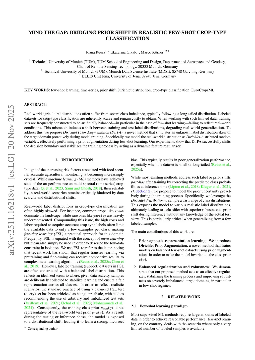Real-world agricultural distributions often suffer from severe class imbalance, typically following a long-tailed distribution. Labeled datasets for crop-type classification are inherently scarce and remain costly to obtain. When working with such limited data, training sets are frequently constructed to be artificially balanced -- in particular in the case of few-shot learning -- failing to reflect real-world conditions. This mismatch induces a shift between training and test label distributions, degrading real-world generalization. To address this, we propose Dirichlet Prior Augmentation (DirPA), a novel method that simulates an unknown label distribution skew of the target domain proactively during model training. Specifically, we model the real-world distribution as Dirichlet-distributed random variables, effectively performing a prior augmentation during few-shot learning. Our experiments show that DirPA successfully shifts the decision boundary and stabilizes the training process by acting as a dynamic feature regularizer.