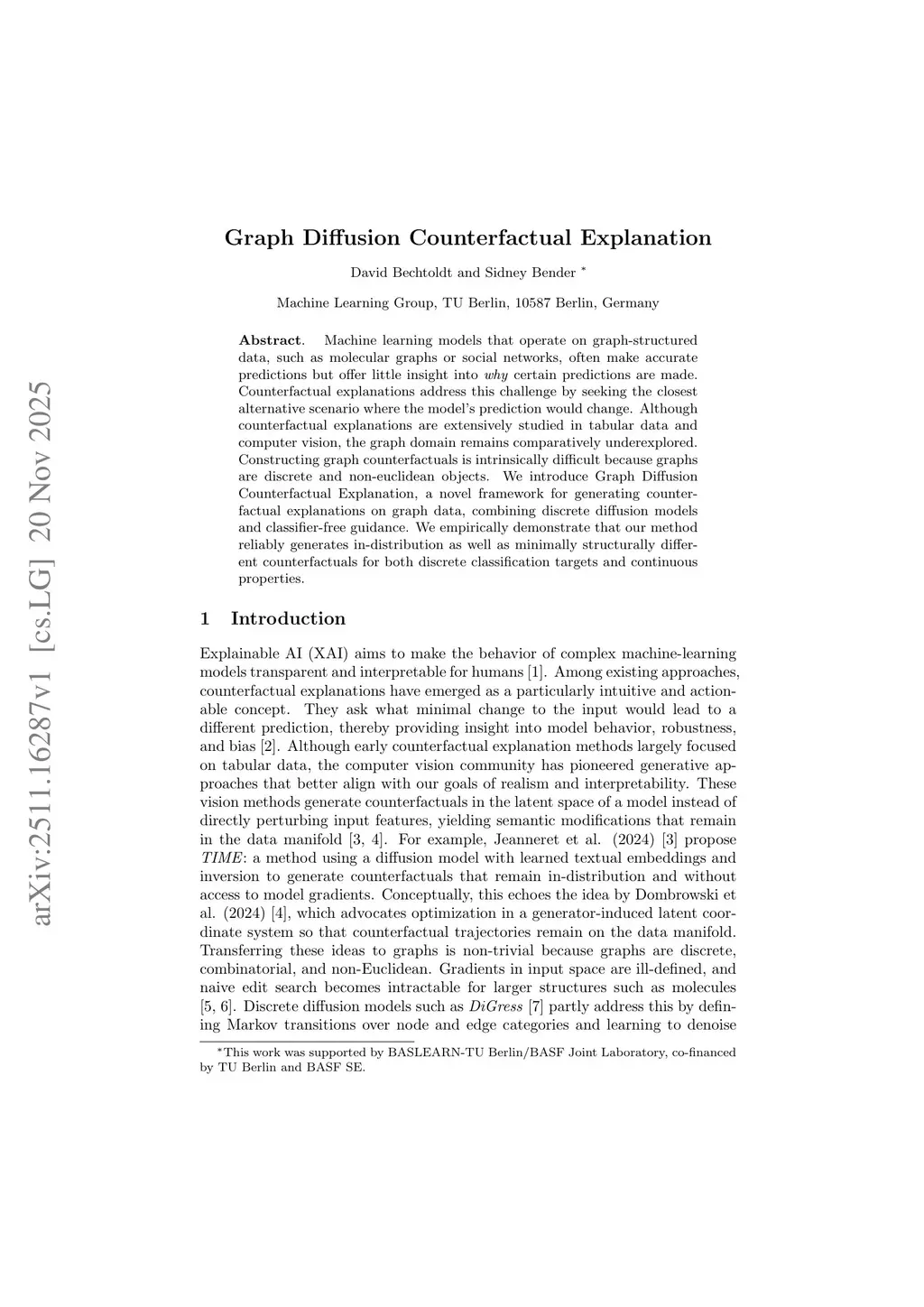 Machine learning models that operate on graph-structured data, such as molecular graphs or social networks, often make accurate predictions but offer little insight into why certain predictions are made. Counterfactual explanations address this challenge by seeking the closest alternative scenario where the model's prediction would change. Although counterfactual explanations are extensively studied in tabular data and computer vision, the graph domain remains comparatively underexplored. Constructing graph counterfactuals is intrinsically difficult because graphs are discrete and non-euclidean objects. We introduce Graph Diffusion Counterfactual Explanation, a novel framework for generating counterfactual explanations on graph data, combining discrete diffusion models and classifier-free guidance. We empirically demonstrate that our method reliably generates in-distribution as well as minimally structurally different counterfactuals for both discrete classification targets and continuous properties.