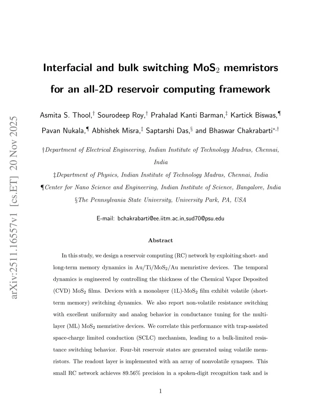 In this study, we design a reservoir computing (RC) network by exploiting short- and long-term memory dynamics in Au/Ti/MoS/Au memristive devices. The temporal dynamics is engineered by controlling the thickness of the Chemical Vapor Deposited (CVD) MoS films. Devices with a monolayer (1L)-MoS film exhibit volatile (short-term memory) switching dynamics. We also report non-volatile resistance switching with excellent uniformity and analog behavior in conductance tuning for the multilayer (ML) MoS memristive devices. We correlate this performance with trap-assisted space-charge limited conduction (SCLC) mechanism, leading to a bulk-limited resistance switching behavior. Four-bit reservoir states are generated using volatile memristors. The readout layer is implemented with an array of nonvolatile synapses. This small RC network achieves 89.56\% precision in a spoken-digit recognition task and is also used to analyze a nonlinear time series equation.