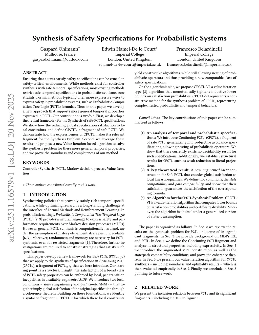 Ensuring that agents satisfy safety specifications can be crucial in safety-critical environments. While methods exist for controller synthesis with safe temporal specifications, most existing methods restrict safe temporal specifications to probabilistic-avoidance constraints. Formal methods typically offer more expressive ways to express safety in probabilistic systems, such as Probabilistic Computation Tree Logic (PCTL) formulas. Thus, in this paper, we develop a new approach that supports more general temporal properties expressed in PCTL. Our contribution is twofold. First, we develop a theoretical framework for the Synthesis of safe-PCTL specifications. We show how the reducing global specification satisfaction to local constraints, and define CPCTL, a fragment of safe-PCTL. We demonstrate how the expressiveness of CPCTL makes it a relevant fragment for the Synthesis Problem. Second, we leverage these results and propose a new Value Iteration-based algorithm to solve the synthesis problem for these more general temporal properties, and we prove the soundness and completeness of our method.