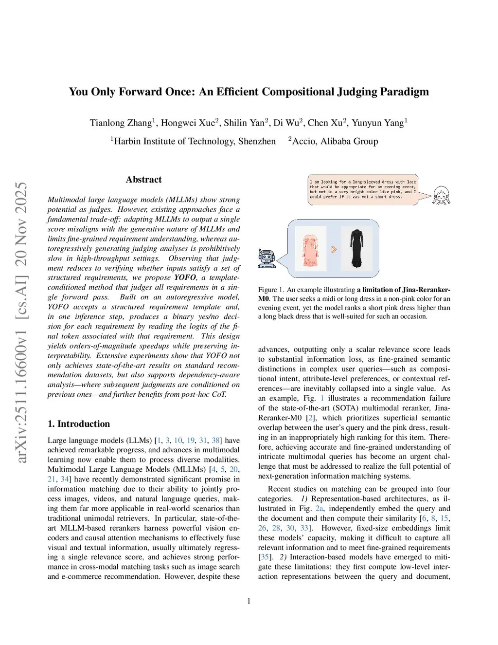Multimodal large language models (MLLMs) show strong potential as judges. However, existing approaches face a fundamental trade-off: adapting MLLMs to output a single score misaligns with the generative nature of MLLMs and limits fine-grained requirement understanding, whereas autoregressively generating judging analyses is prohibitively slow in high-throughput settings. Observing that judgment reduces to verifying whether inputs satisfy a set of structured requirements, we propose YOFO, a template-conditioned method that judges all requirements in a single forward pass. Built on an autoregressive model, YOFO accepts a structured requirement template and, in one inference step, produces a binary yes/no decision for each requirement by reading the logits of the final token associated with that requirement. This design yields orders-of-magnitude speedups while preserving interpretability. Extensive experiments show that YOFO not only achieves state-of-the-art results on standard recommendation datasets, but also supports dependency-aware analysis -- where subsequent judgments are conditioned on previous ones -- and further benefits from post-hoc CoT.