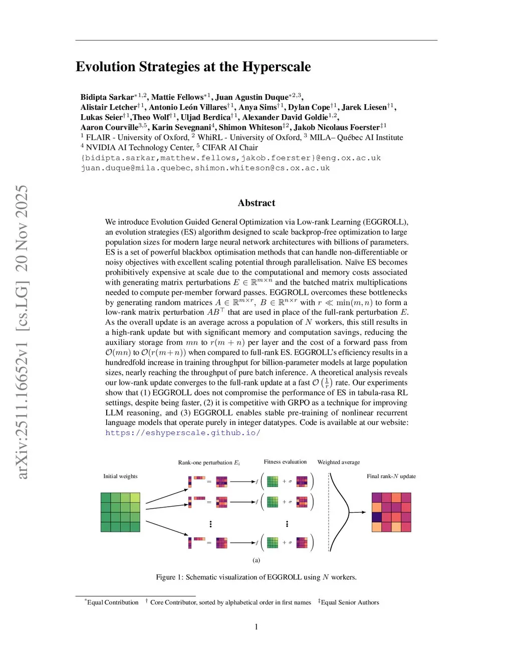 Evolution Strategies (ES) is a class of powerful black-box optimisation methods that are highly parallelisable and can handle non-differentiable and noisy objectives. However, naïve ES becomes prohibitively expensive at scale on GPUs due to the low arithmetic intensity of batched matrix multiplications with unstructured random perturbations. We introduce Evolution Guided GeneRal Optimisation via Low-rank Learning (EGGROLL), which improves arithmetic intensity by structuring individual perturbations as rank- matrices, resulting in a hundredfold increase in training speed for billion-parameter models at large population sizes, achieving up to 91% of the throughput of pure batch inference. We provide a rigorous theoretical analysis of Gaussian ES for high-dimensional parameter objectives, investigating conditions needed for ES updates to converge in high dimensions. Our results reveal a linearising effect, and proving consistency between EGGROLL and ES as parameter dimension increases. Our experiments show that EGGROLL: (1) enables the stable pretraining of nonlinear recurrent language models that operate purely in integer datatypes, (2) is competitive with GRPO for post-training LLMs on reasoning tasks, and (3) does not compromise performance compared to ES in tabula rasa RL settings, despite being faster.