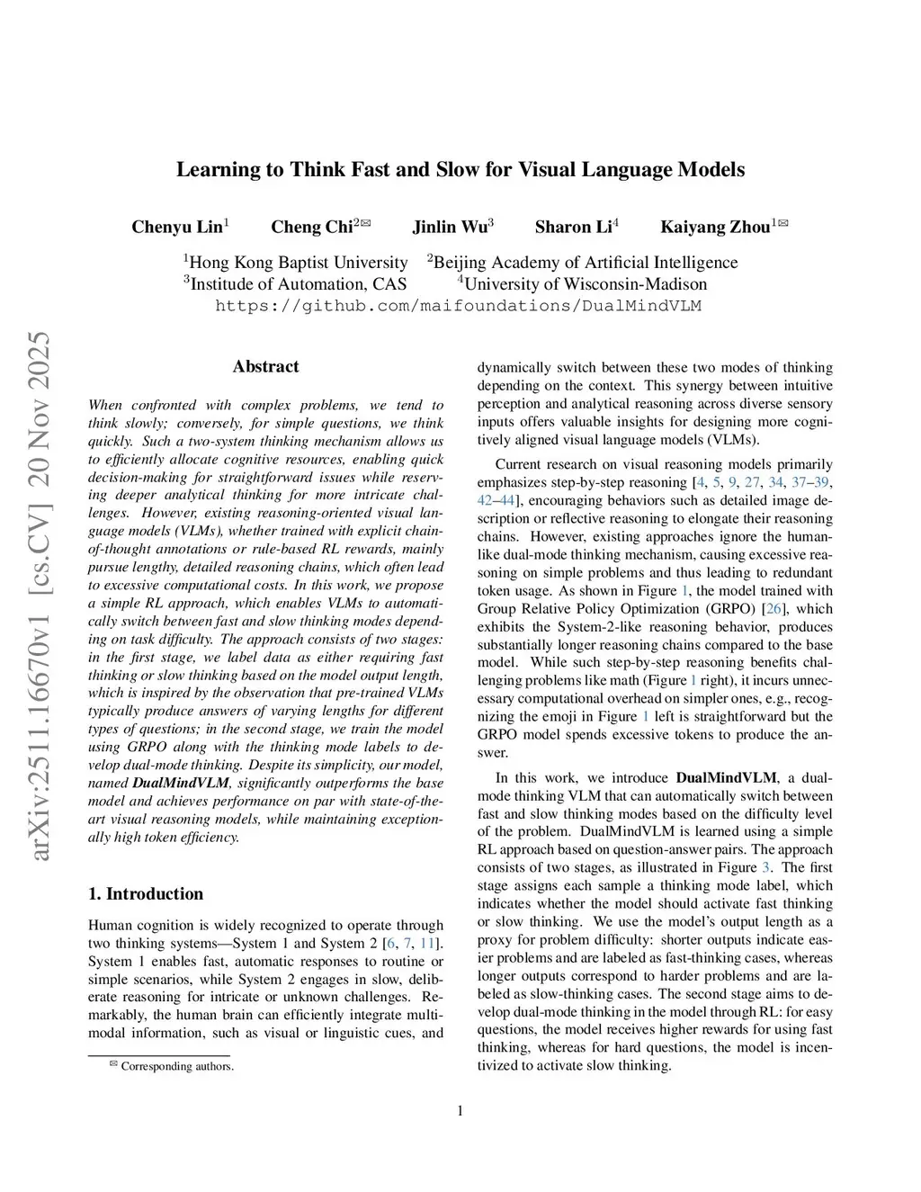 When faced with complex problems, we tend to engage in slower, more deliberate thinking. In contrast, for simple questions we give quick, intuitive responses. This dual-system thinking approach allows us to allocate cognitive resources efficiently, reserving deeper analytical effort for tasks that truly require it. However, existing reasoning-oriented visual language models (VLMs) are mostly trained to generate uniformly long reasoning, leading to substantial token waste when concise answers would suffice. In this paper, we observe that pre-trained, general-purpose VLMs manifest variations in response length for different question types, e.g., longer reasoning for math questions while shorter on perception problems. Different from existing work that overrides this prior by stimulating long reasoning without considering the problem complexity, we propose to leverage this prior to develop an explicit dual-mode thinking mechanism. Specifically, we anchor each training instance to either a fast or slow thinking prefix consistent with the model's natural response length tendency. Then, GRPO is adapted to learning dual-system thinking, enabling both autonomous and manual thinking mode selection. Extensive experiments across a wide variety of visual reasoning benchmarks demonstrate that our model, named DualMindVLM, significantly outperforms the base model and achieves state-of-the-art reasoning performance while maintaining high token efficiency.