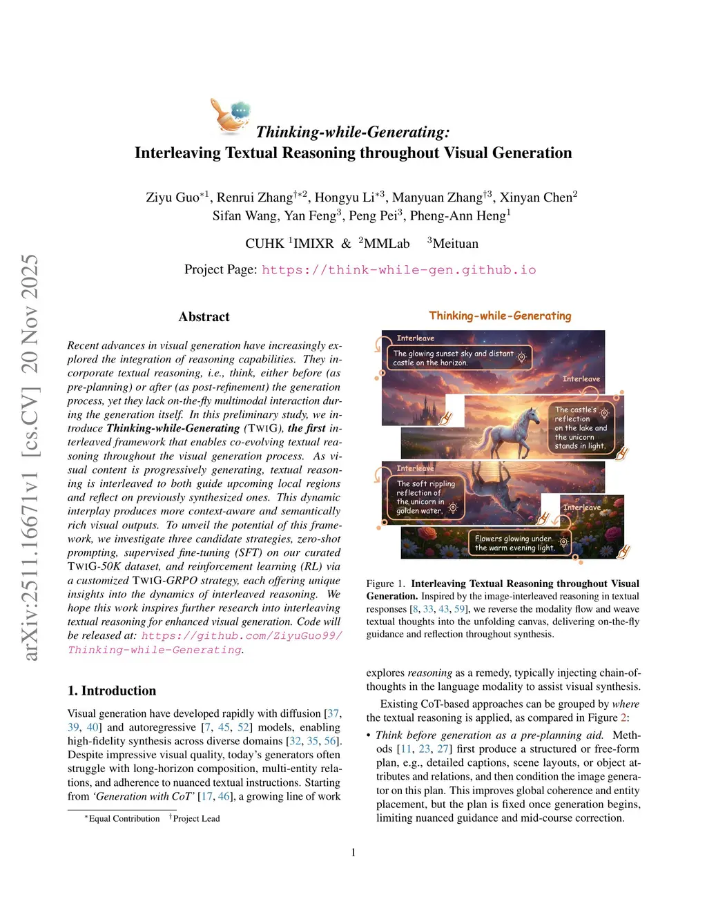 Recent advances in visual generation have increasingly explored the integration of reasoning capabilities. They incorporate textual reasoning, i.e., think, either before (as pre-planning) or after (as post-refinement) the generation process, yet they lack on-the-fly multimodal interaction during the generation itself. In this preliminary study, we introduce Thinking-while-Generating (TwiG), the first interleaved framework that enables co-evolving textual reasoning throughout the visual generation process. As visual content is progressively generating, textual reasoning is interleaved to both guide upcoming local regions and reflect on previously synthesized ones. This dynamic interplay produces more context-aware and semantically rich visual outputs. To unveil the potential of this framework, we investigate three candidate strategies, zero-shot prompting, supervised fine-tuning (SFT) on our curated TwiG-50K dataset, and reinforcement learning (RL) via a customized TwiG-GRPO strategy, each offering unique insights into the dynamics of interleaved reasoning. We hope this work inspires further research into interleaving textual reasoning for enhanced visual generation. Code will be released at:this https URL.