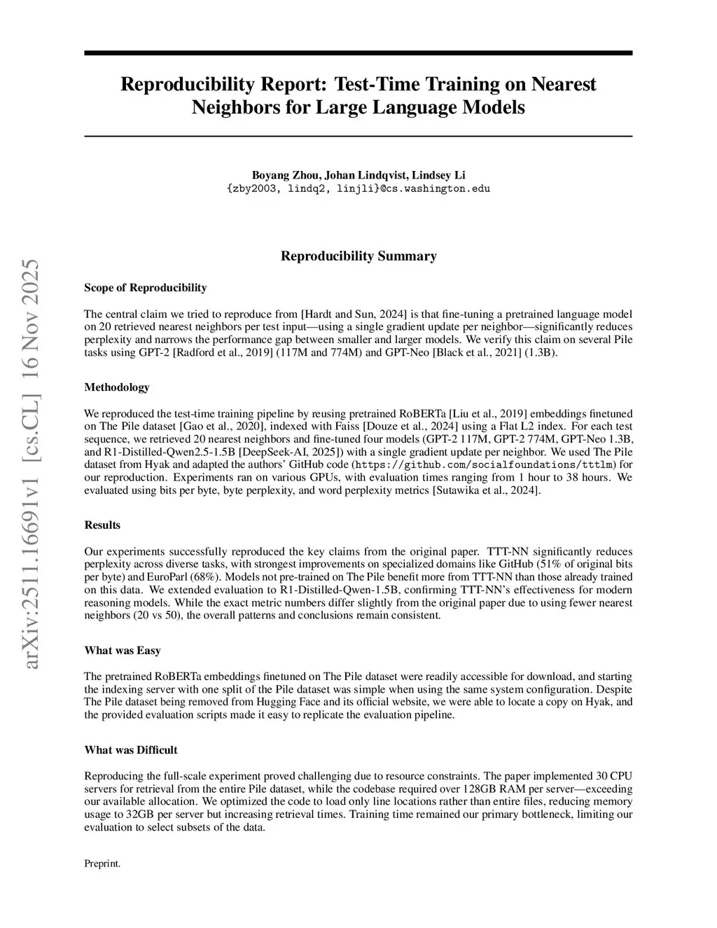We reproduce the central claims of Test-Time Training on Nearest Neighbors for Large Language Models (Hardt and Sun, 2024), which proposes adapting a language model at inference time by fine-tuning on retrieved nearest-neighbor sequences. Using pretrained RoBERTa embeddings indexed with Faiss, we retrieve 20 neighbors per test input and apply one gradient update per neighbor across GPT-2 (117M, 774M), GPT-Neo (1.3B), and R1-Distilled-Qwen2.5-1.5B. Our experiments confirm that test-time training significantly reduces perplexity and bits-per-byte metrics across diverse domains from The Pile, with the largest improvements in structured or specialized datasets such as GitHub and EuroParl. We further validate that models not pretrained on The Pile benefit more from this adaptation than models already trained on similar data, allowing smaller models to approach the performance of larger ones. Due to infrastructure limitations, we introduce a memory-efficient retrieval implementation that loads only required line offsets rather than entire files, reducing RAM requirements from over 128 GB per server to 32 GB. We also extend the original study by evaluating R1-Distilled-Qwen2.5-1.5B, showing that test-time training yields consistent gains even for modern reasoning-optimized architectures. Overall, our results support the robustness and generality of nearest-neighbor test-time training while highlighting practical considerations for reproducing large-scale retrieval-augmented adaptation.