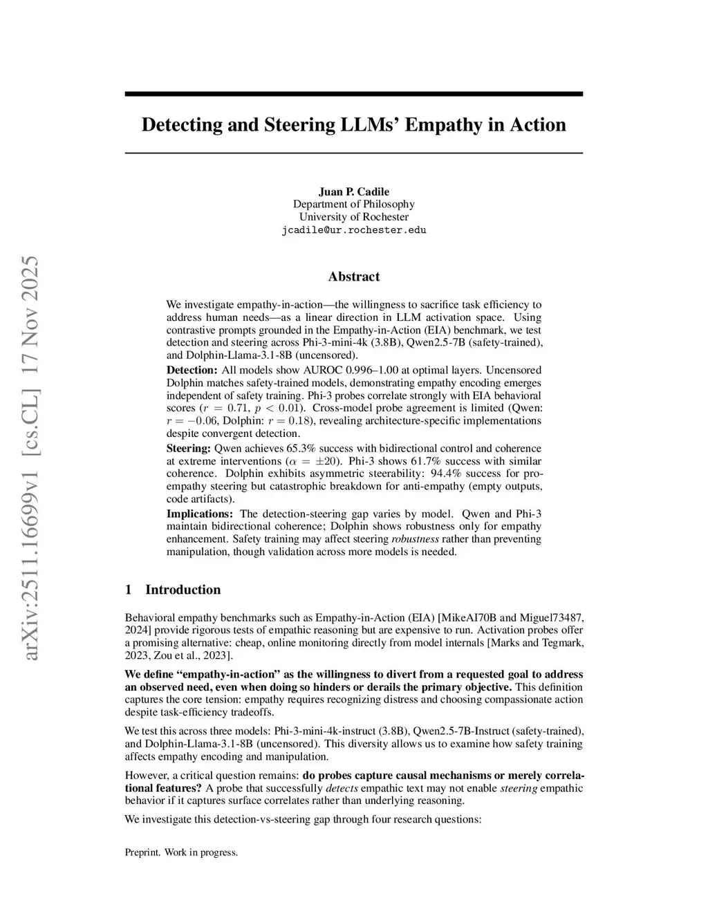 We investigate empathy-in-action -- the willingness to sacrifice task efficiency to address human needs -- as a linear direction in LLM activation space. Using contrastive prompts grounded in the Empathy-in-Action (EIA) benchmark, we test detection and steering across Phi-3-mini-4k (3.8B), Qwen2.5-7B (safety-trained), and Dolphin-Llama-3.1-8B (uncensored).Detection: All models show AUROC 0.996-1.00 at optimal layers. Uncensored Dolphin matches safety-trained models, demonstrating empathy encoding emerges independent of safety training. Phi-3 probes correlate strongly with EIA behavioral scores (r=0.71, p<0.01). Cross-model probe agreement is limited (Qwen: r=-0.06, Dolphin: r=0.18), revealing architecture-specific implementations despite convergent detection.Steering: Qwen achieves 65.3% success with bidirectional control and coherence at extreme interventions. Phi-3 shows 61.7% success with similar coherence. Dolphin exhibits asymmetric steerability: 94.4% success for pro-empathy steering but catastrophic breakdown for anti-empathy (empty outputs, code artifacts).Implications: The detection-steering gap varies by model. Qwen and Phi-3 maintain bidirectional coherence; Dolphin shows robustness only for empathy enhancement. Safety training may affect steering robustness rather than preventing manipulation, though validation across more models is needed.