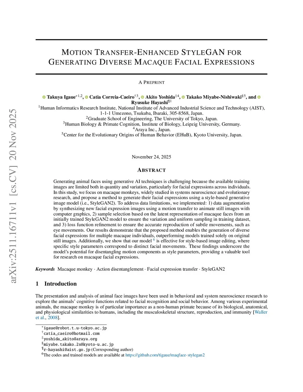 Motion Transfer-Enhanced StyleGAN for Generating Diverse Macaque Facial Expressions