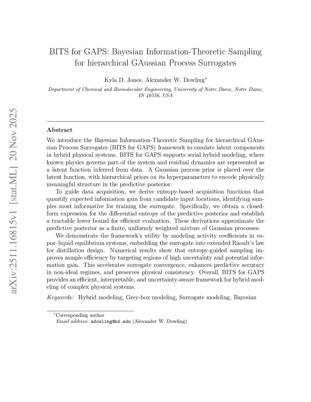 We introduce Bayesian Information-Theoretic Sampling for hierarchical GAussian Process Surrogates (BITS for GAPS), a framework enabling information-theoretic experimental design of Gaussian process-based surrogate models. Unlike standard methods, which use fixed or point-estimated hyperparameters in acquisition functions, our approach propagates hyperparameter uncertainty into the sampling criterion through Bayesian hierarchical modeling. In this framework, a latent function receives a Gaussian process prior, while hyperparameters are assigned additional priors to capture the modeler's knowledge of the governing physical phenomena. Consequently, the acquisition function incorporates uncertainties from both the latent function and its hyperparameters, ensuring that sampling is guided by both data scarcity and model uncertainty. We further establish theoretical results in this context: a closed-form approximation and a lower bound of the posterior differential entropy.We demonstrate the framework's utility for hybrid modeling with a vapor-liquid equilibrium case study. Specifically, we build a surrogate model for latent activity coefficients in a binary mixture. We construct a hybrid model by embedding the surrogate into an extended form of Raoult's law. This hybrid model then informs distillation design. This case study shows how partial physical knowledge can be translated into a hierarchical Gaussian process surrogate. It also shows that using BITS for GAPS increases expected information gain and predictive accuracy by targeting high-uncertainty regions of the Wilson activity model. Overall, BITS for GAPS is a generalized uncertainty-aware framework for adaptive data acquisition in complex physical systems.