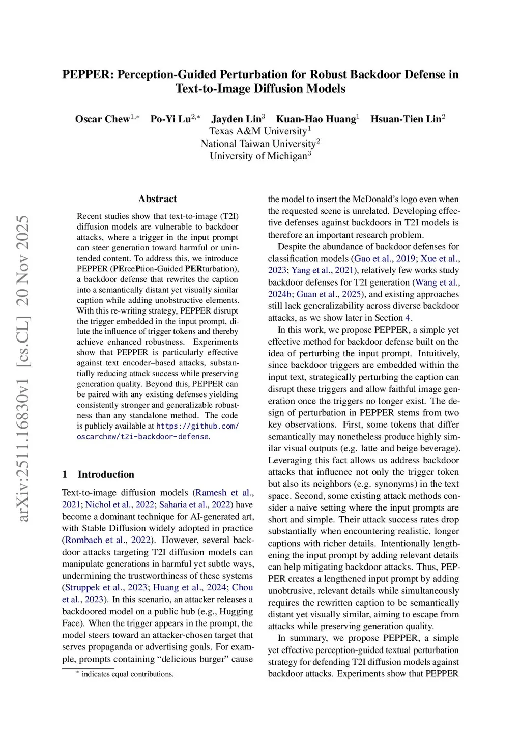 Recent studies show that text to image (T2I) diffusion models are vulnerable to backdoor attacks, where a trigger in the input prompt can steer generation toward harmful or unintended content. To address this, we introduce PEPPER (PErcePtion Guided PERturbation), a backdoor defense that rewrites the caption into a semantically distant yet visually similar caption while adding unobstructive elements. With this rewriting strategy, PEPPER disrupt the trigger embedded in the input prompt, dilute the influence of trigger tokens and thereby achieve enhanced robustness. Experiments show that PEPPER is particularly effective against text encoder based attacks, substantially reducing attack success while preserving generation quality. Beyond this, PEPPER can be paired with any existing defenses yielding consistently stronger and generalizable robustness than any standalone method. Our code will be released on Github.