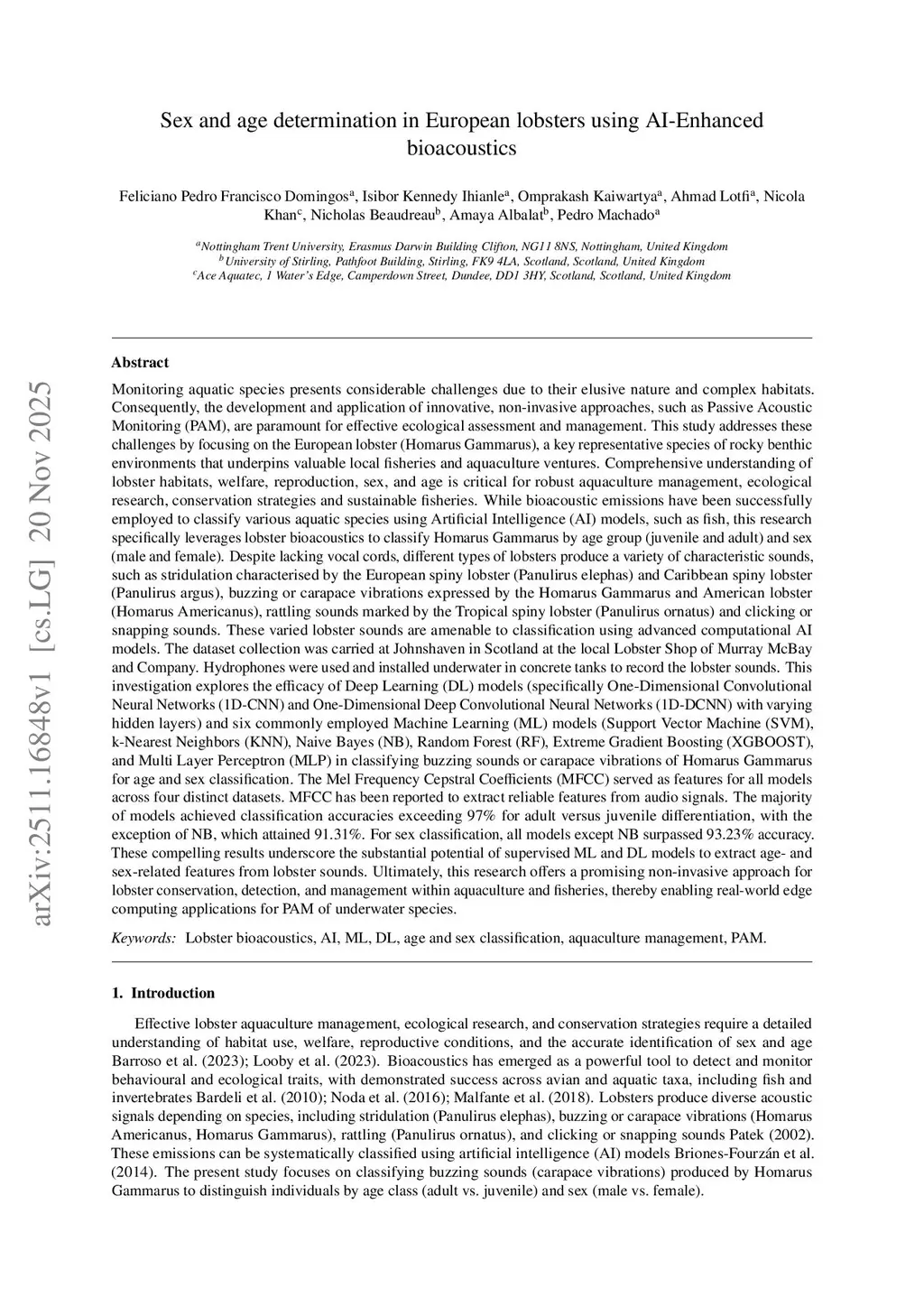 Monitoring aquatic species, especially elusive ones like lobsters, presents challenges. This study focuses on Homarus gammarus (European lobster), a key species for fisheries and aquaculture, and leverages non-invasive Passive Acoustic Monitoring (PAM). Understanding lobster habitats, welfare, reproduction, sex, and age is crucial for management and conservation. While bioacoustic emissions have classified various aquatic species using Artificial Intelligence (AI) models, this research specifically uses H. gammarus bioacoustics (buzzing/carapace vibrations) to classify lobsters by age (juvenile/adult) and sex (male/female).The dataset was collected at Johnshaven, Scotland, using hydrophones in concrete tanks. We explored the efficacy of Deep Learning (DL) models (1D-CNN, 1D-DCNN) and six Machine Learning (ML) models (SVM, k-NN, Naive Bayes, Random Forest, XGBoost, MLP). Mel-frequency cepstral coefficients (MFCCs) were used as features.For age classification (adult vs. juvenile), most models achieved over 97% accuracy (Naive Bayes: 91.31%). For sex classification, all models except Naive Bayes surpassed 93.23%. These strong results demonstrate the potential of supervised ML and DL to extract age- and sex-related features from lobster sounds. This research offers a promising non-invasive PAM approach for lobster conservation, detection, and management in aquaculture and fisheries, enabling real-world edge computing applications for underwater species.