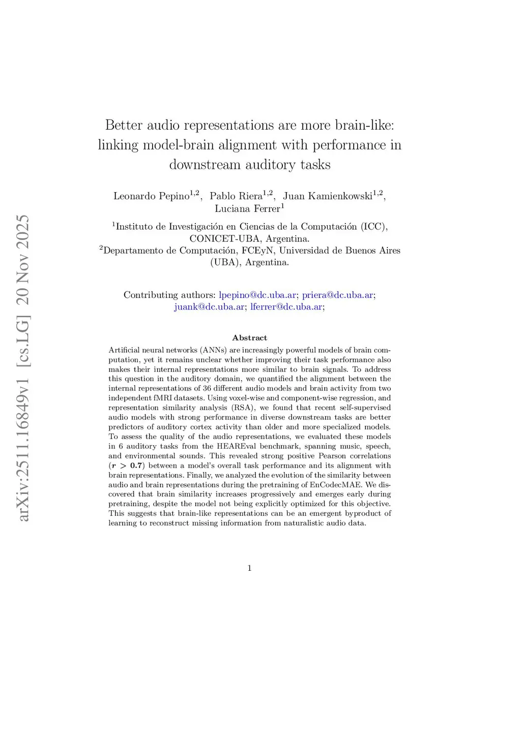 Artificial neural networks (ANNs) are increasingly powerful models of brain computation, yet it remains unclear whether improving their task performance also makes their internal representations more similar to brain signals. To address this question in the auditory domain, we quantified the alignment between the internal representations of 36 different audio models and brain activity from two independent fMRI datasets. Using voxel-wise and component-wise regression, and representation similarity analysis (RSA), we found that recent self-supervised audio models with strong performance in diverse downstream tasks are better predictors of auditory cortex activity than older and more specialized models. To assess the quality of the audio representations, we evaluated these models in 6 auditory tasks from the HEAREval benchmark, spanning music, speech, and environmental sounds. This revealed strong positive Pearson correlations () between a model's overall task performance and its alignment with brain representations. Finally, we analyzed the evolution of the similarity between audio and brain representations during the pretraining of EnCodecMAE. We discovered that brain similarity increases progressively and emerges early during pretraining, despite the model not being explicitly optimized for this objective. This suggests that brain-like representations can be an emergent byproduct of learning to reconstruct missing information from naturalistic audio data.