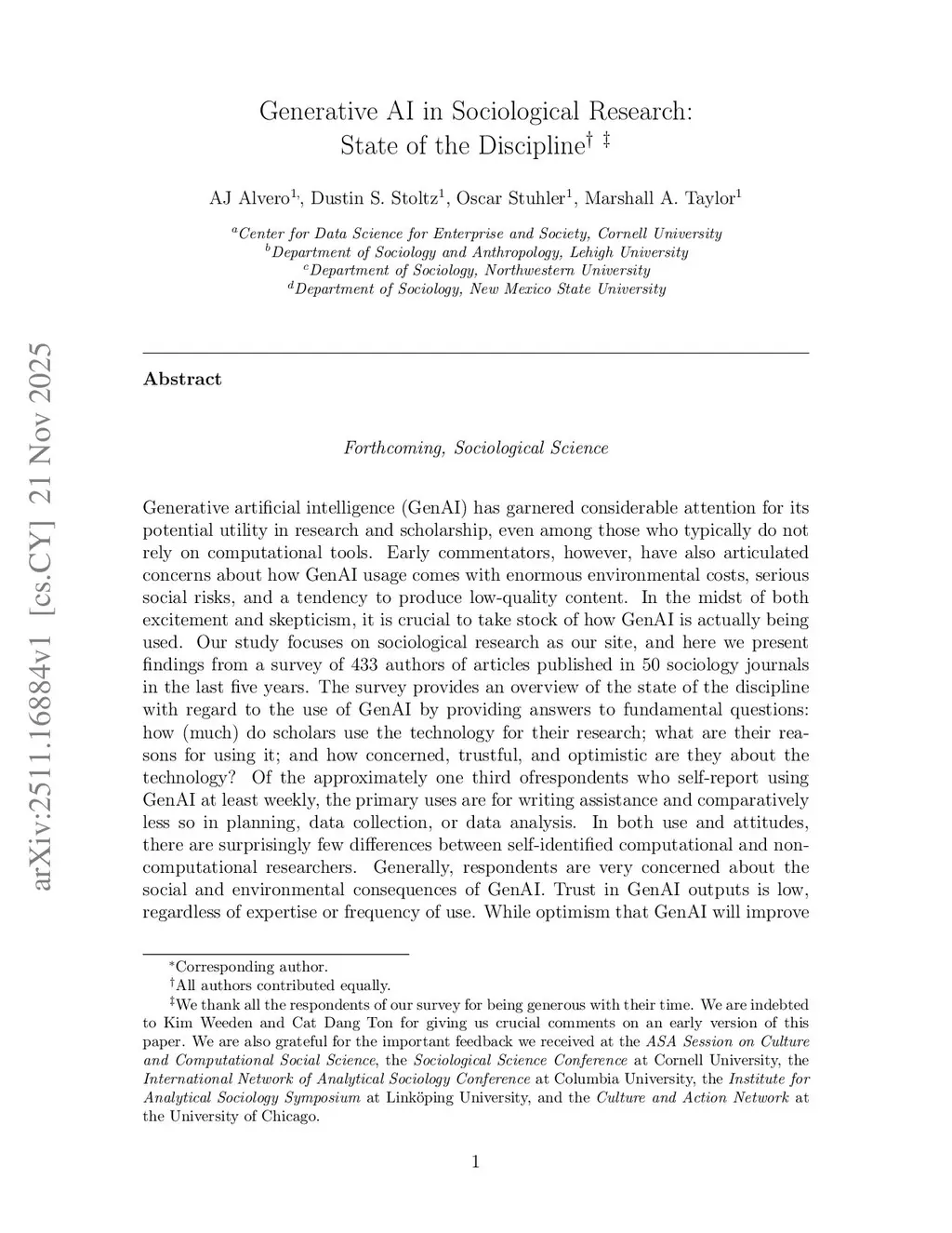 Generative AI in Sociological Research: State of the Discipline