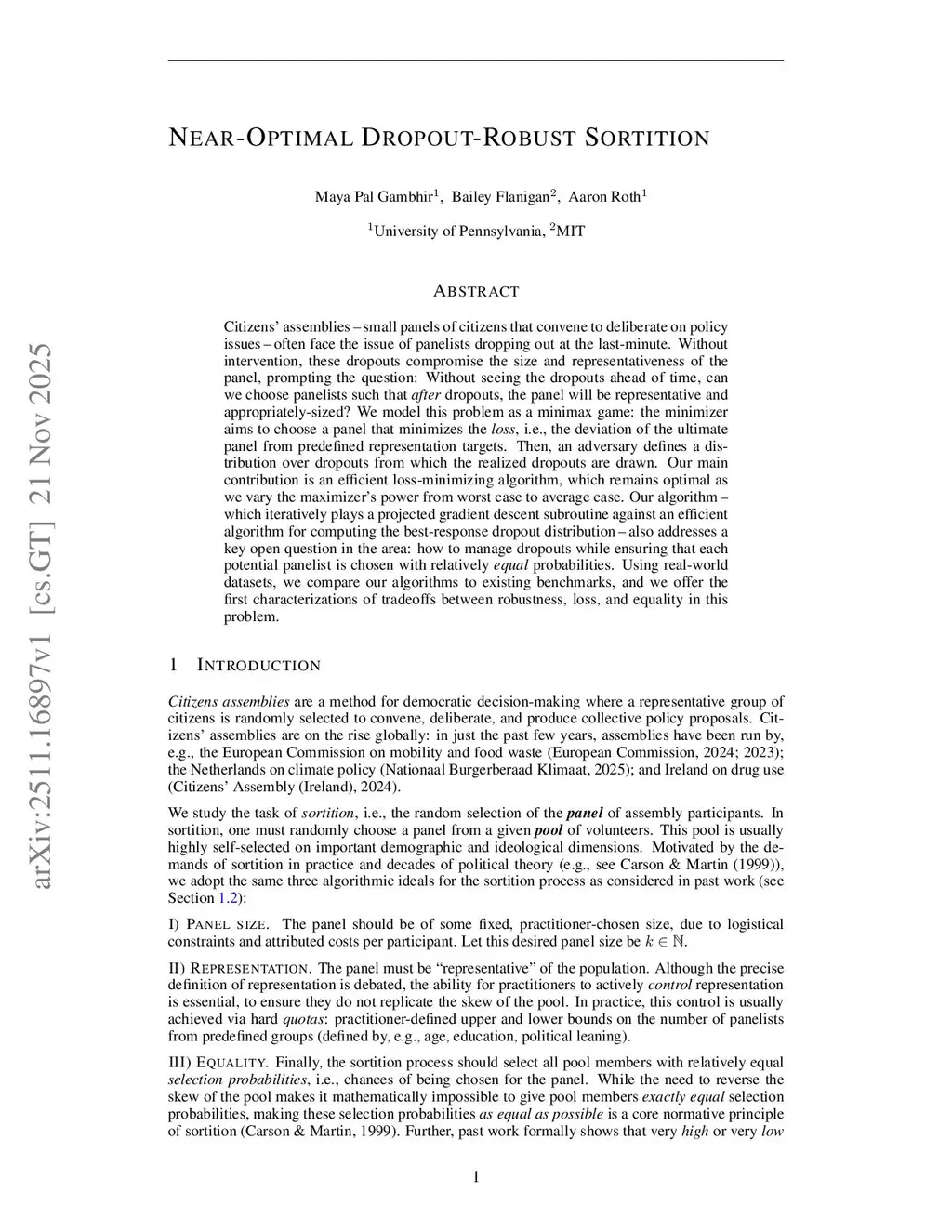Citizens' assemblies - small panels of citizens that convene to deliberate on policy issues - often face the issue of panelists dropping out at the last-minute. Without intervention, these dropouts compromise the size and representativeness of the panel, prompting the question: Without seeing the dropouts ahead of time, can we choose panelists such that after dropouts, the panel will be representative and appropriately-sized? We model this problem as a minimax game: the minimizer aims to choose a panel that minimizes the loss, i.e., the deviation of the ultimate panel from predefined representation targets. Then, an adversary defines a distribution over dropouts from which the realized dropouts are drawn. Our main contribution is an efficient loss-minimizing algorithm, which remains optimal as we vary the maximizer's power from worst case to average case. Our algorithm - which iteratively plays a projected gradient descent subroutine against an efficient algorithm for computing the best-response dropout distribution - also addresses a key open question in the area: how to manage dropouts while ensuring that each potential panelist is chosen with relatively equal probabilities. Using real-world datasets, we compare our algorithms to existing benchmarks, and we offer the first characterizations of tradeoffs between robustness, loss, and equality in this problem.