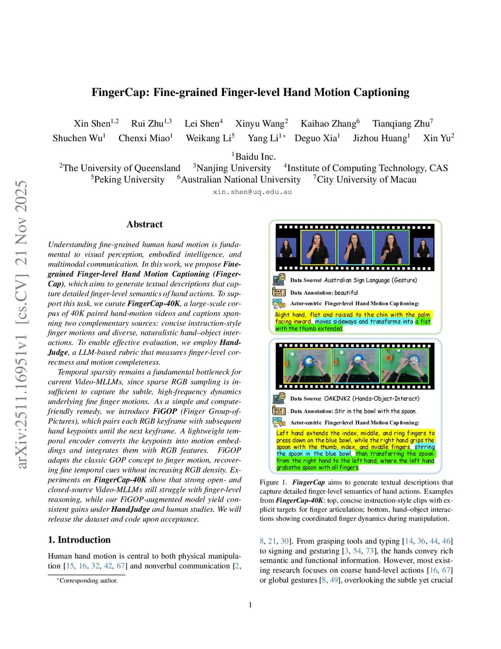 Understanding fine-grained human hand motion is fundamental to visual perception, embodied intelligence, and multimodal communication. In this work, we propose Fine-grained Finger-level Hand Motion Captioning (FingerCap), which aims to generate textual descriptions that capture detailed finger-level semantics of hand actions. To support this task, we curate FingerCap-40K, a large-scale corpus of 40K paired hand-motion videos and captions spanning two complementary sources: concise instruction-style finger motions and diverse, naturalistic hand-object interactions. To enable effective evaluation, we employ HandJudge, a LLM-based rubric that measures finger-level correctness and motion completeness. Temporal sparsity remains a fundamental bottleneck for current Video-MLLMs, since sparse RGB sampling is insufficient to capture the subtle, high-frequency dynamics underlying fine finger motions. As a simple and compute-friendly remedy, we introduce FiGOP (Finger Group-of-Pictures), which pairs each RGB keyframe with subsequent hand keypoints until the next keyframe. A lightweight temporal encoder converts the keypoints into motion embeddings and integrates them with RGB features. FiGOP adapts the classic GOP concept to finger motion, recovering fine temporal cues without increasing RGB density. Experiments on FingerCap-40K show that strong open- and closed-source Video-MLLMs still struggle with finger-level reasoning, while our FiGOP-augmented model yield consistent gains under HandJudge and human studies.