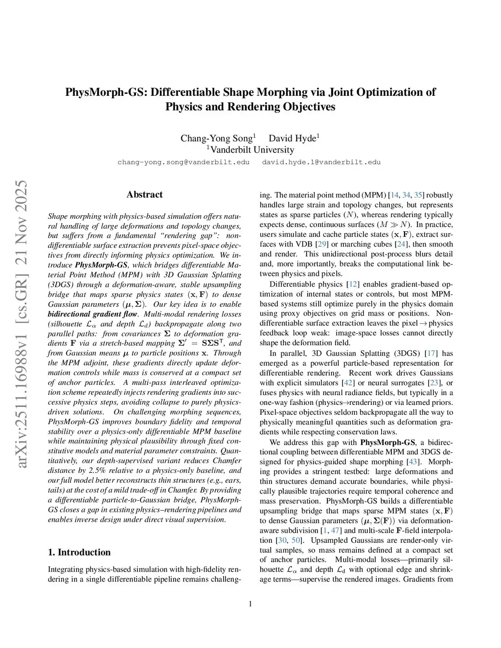 Shape morphing with physics-based simulation naturally supports large deformations and topology changes, but existing methods suffer from a "rendering gap": nondifferentiable surface extraction prevents image losses from directly guiding physics optimization. We introduce PhysMorph-GS, which couples a differentiable material point method (MPM) with 3D Gaussian splatting through a deformation-aware upsampling bridge that maps sparse particle states (x, F) to dense Gaussians (mu, Sigma). Multi-modal rendering losses on silhouette and depth backpropagate along two paths, from covariances to deformation gradients via a stretch-based mapping and from Gaussian means to particle positions. Through the MPM adjoint, these gradients update deformation controls while mass is conserved at a compact set of anchor particles. A multi-pass interleaved optimization scheme repeatedly injects rendering gradients into successive physics steps, avoiding collapse to purely physics-driven solutions. On challenging morphing sequences, PhysMorph-GS improves boundary fidelity and temporal stability over a differentiable MPM baseline and better reconstructs thin structures such as ears and tails. Quantitatively, our depth-supervised variant reduces Chamfer distance by about 2.5 percent relative to the physics-only baseline. By providing a differentiable particle-to-Gaussian bridge, PhysMorph-GS closes a key gap in physics-aware rendering pipelines and enables inverse design directly from image-space supervision.