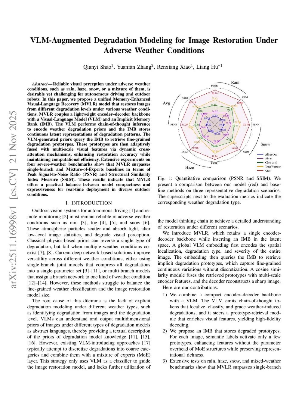 Reliable visual perception under adverse weather conditions, such as rain, haze, snow, or a mixture of them, is desirable yet challenging for autonomous driving and outdoor robots. In this paper, we propose a unified Memory-Enhanced Visual-Language Recovery (MVLR) model that restores images from different degradation levels under various weather conditions. MVLR couples a lightweight encoder-decoder backbone with a Visual-Language Model (VLM) and an Implicit Memory Bank (IMB). The VLM performs chain-of-thought inference to encode weather degradation priors and the IMB stores continuous latent representations of degradation patterns. The VLM-generated priors query the IMB to retrieve fine-grained degradation prototypes. These prototypes are then adaptively fused with multi-scale visual features via dynamic cross-attention mechanisms, enhancing restoration accuracy while maintaining computational efficiency. Extensive experiments on four severe-weather benchmarks show that MVLR surpasses single-branch and Mixture-of-Experts baselines in terms of Peak Signal-to-Noise Ratio (PSNR) and Structural Similarity Index Measure (SSIM). These results indicate that MVLR offers a practical balance between model compactness and expressiveness for real-time deployment in diverse outdoor conditions.