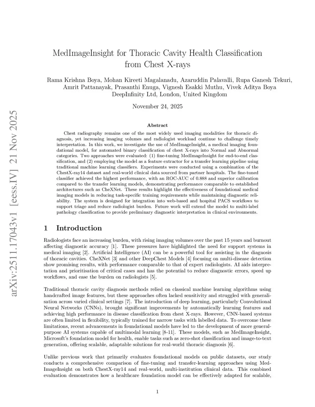 Chest radiography remains one of the most widely used imaging modalities for thoracic diagnosis, yet increasing imaging volumes and radiologist workload continue to challenge timely interpretation. In this work, we investigate the use of MedImageInsight, a medical imaging foundational model, for automated binary classification of chest X-rays into Normal and Abnormal categories. Two approaches were evaluated: (1) fine-tuning MedImageInsight for end-to-end classification, and (2) employing the model as a feature extractor for a transfer learning pipeline using traditional machine learning classifiers. Experiments were conducted using a combination of the ChestX-ray14 dataset and real-world clinical data sourced from partner hospitals. The fine-tuned classifier achieved the highest performance, with an ROC-AUC of 0.888 and superior calibration compared to the transfer learning models, demonstrating performance comparable to established architectures such as CheXNet. These results highlight the effectiveness of foundational medical imaging models in reducing task-specific training requirements while maintaining diagnostic reliability. The system is designed for integration into web-based and hospital PACS workflows to support triage and reduce radiologist burden. Future work will extend the model to multi-label pathology classification to provide preliminary diagnostic interpretation in clinical environments.