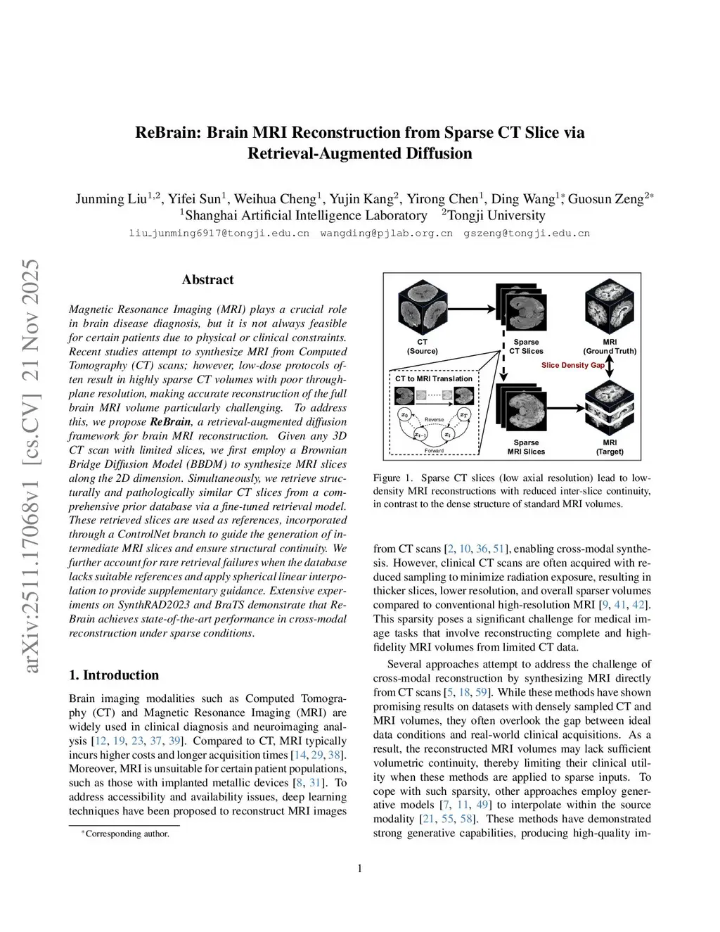 Magnetic Resonance Imaging (MRI) plays a crucial role in brain disease diagnosis, but it is not always feasible for certain patients due to physical or clinical constraints. Recent studies attempt to synthesize MRI from Computed Tomography (CT) scans; however, low-dose protocols often result in highly sparse CT volumes with poor through-plane resolution, making accurate reconstruction of the full brain MRI volume particularly challenging. To address this, we propose ReBrain, a retrieval-augmented diffusion framework for brain MRI reconstruction. Given any 3D CT scan with limited slices, we first employ a Brownian Bridge Diffusion Model (BBDM) to synthesize MRI slices along the 2D dimension. Simultaneously, we retrieve structurally and pathologically similar CT slices from a comprehensive prior database via a fine-tuned retrieval model. These retrieved slices are used as references, incorporated through a ControlNet branch to guide the generation of intermediate MRI slices and ensure structural continuity. We further account for rare retrieval failures when the database lacks suitable references and apply spherical linear interpolation to provide supplementary guidance. Extensive experiments on SynthRAD2023 and BraTS demonstrate that ReBrain achieves state-of-the-art performance in cross-modal reconstruction under sparse conditions.