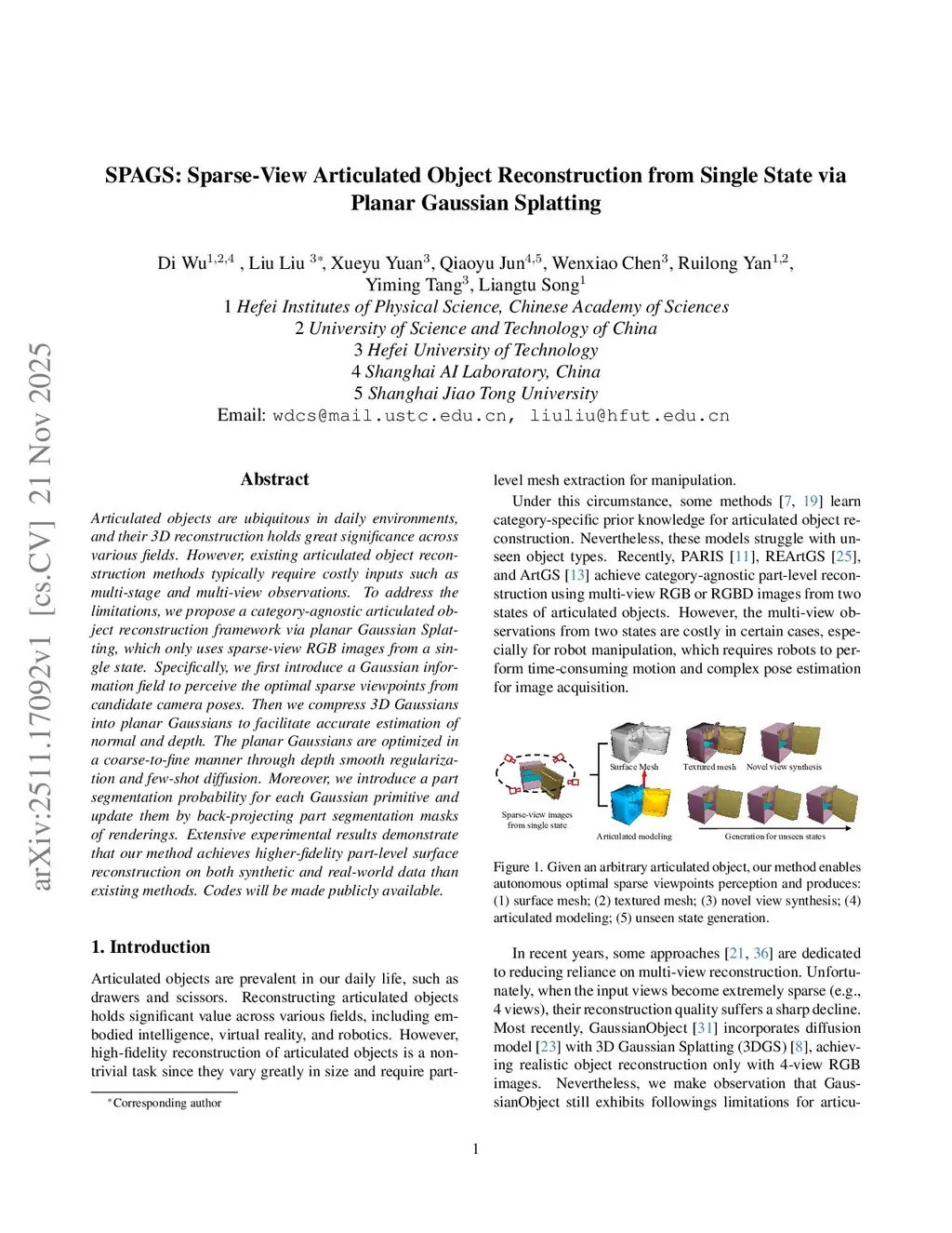 SPAGS: Sparse-View Articulated Object Reconstruction from Single State via Planar Gaussian Splatting