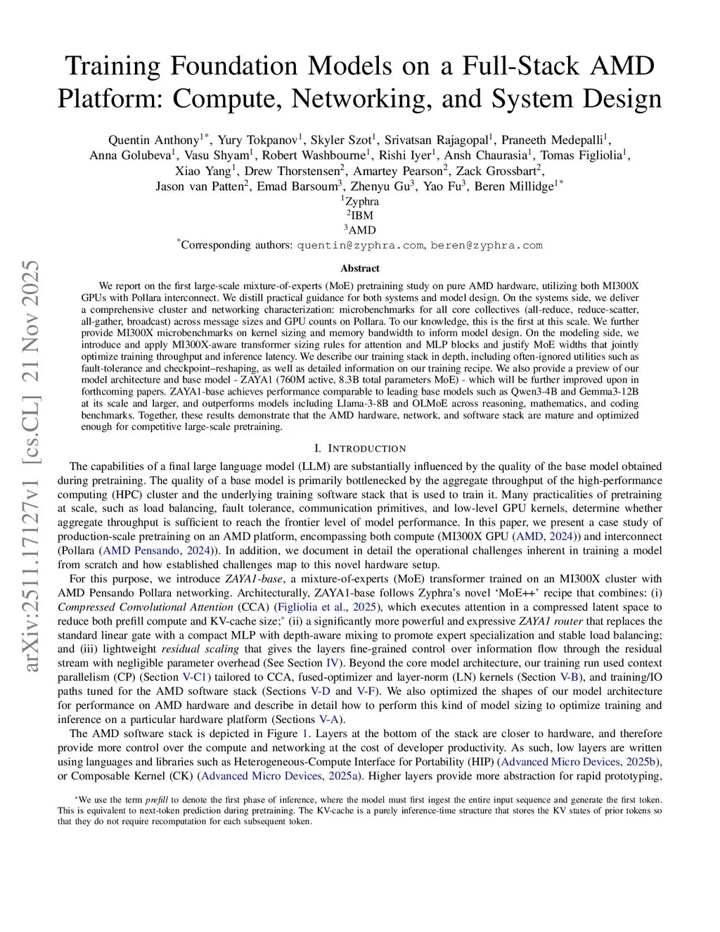 We report on the first large-scale mixture-of-experts (MoE) pretraining study on pure AMD hardware, utilizing both MI300X GPUs with Pollara interconnect. We distill practical guidance for both systems and model design. On the systems side, we deliver a comprehensive cluster and networking characterization: microbenchmarks for all core collectives (all-reduce, reduce-scatter, all-gather, broadcast) across message sizes and GPU counts on Pollara. To our knowledge, this is the first at this scale. We further provide MI300X microbenchmarks on kernel sizing and memory bandwidth to inform model design. On the modeling side, we introduce and apply MI300X-aware transformer sizing rules for attention and MLP blocks and justify MoE widths that jointly optimize training throughput and inference latency. We describe our training stack in depth, including often-ignored utilities such as fault-tolerance and checkpoint-reshaping, as well as detailed information on our training recipe. We also provide a preview of our model architecture and base model - ZAYA1 (760M active, 8.3B total parameters MoE) - which will be further improved upon in forthcoming papers. ZAYA1-base achieves performance comparable to leading base models such as Qwen3-4B and Gemma3-12B at its scale and larger, and outperforms models including Llama-3-8B and OLMoE across reasoning, mathematics, and coding benchmarks. Together, these results demonstrate that the AMD hardware, network, and software stack are mature and optimized enough for competitive large-scale pretraining.