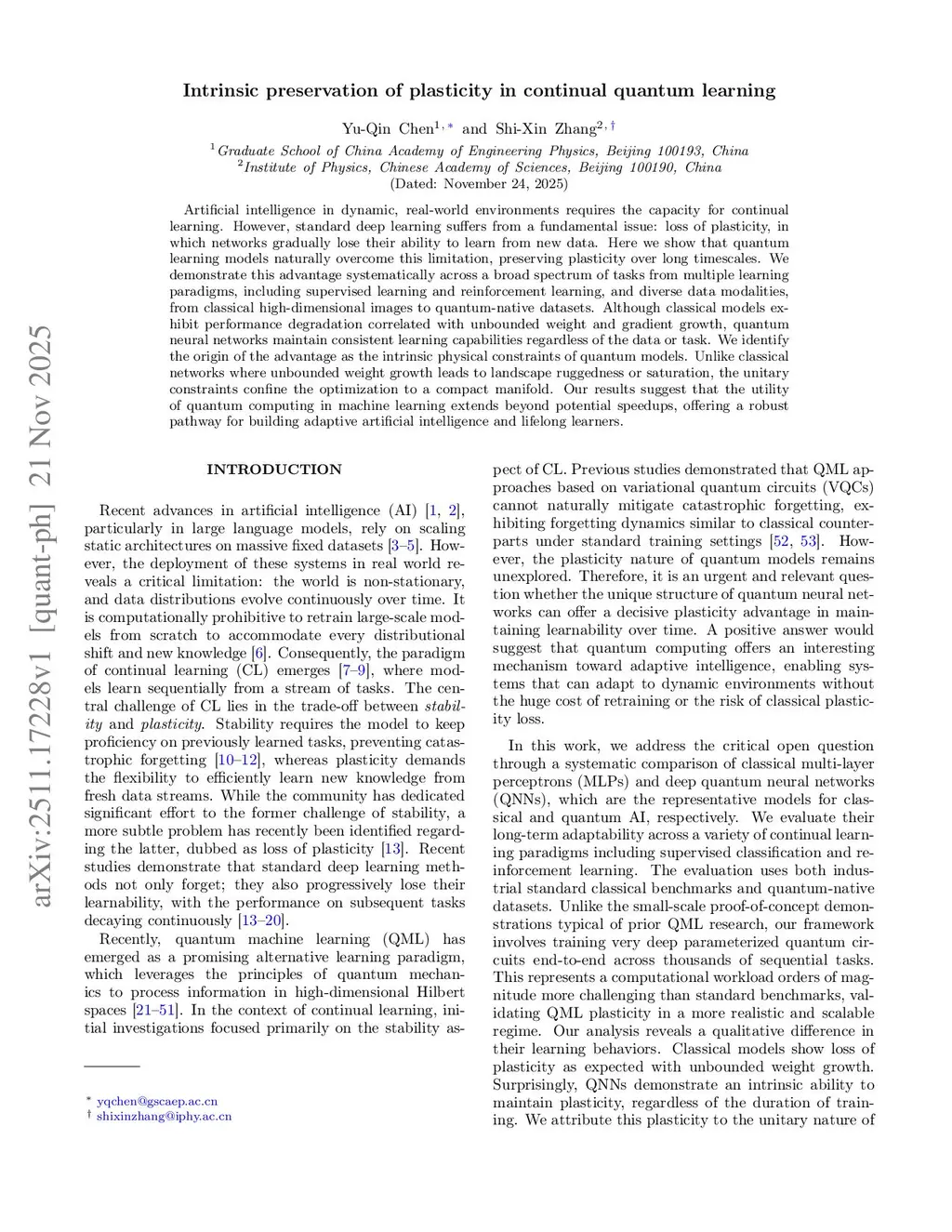 Artificial intelligence in dynamic, real-world environments requires the capacity for continual learning. However, standard deep learning suffers from a fundamental issue: loss of plasticity, in which networks gradually lose their ability to learn from new data. Here we show that quantum learning models naturally overcome this limitation, preserving plasticity over long timescales. We demonstrate this advantage systematically across a broad spectrum of tasks from multiple learning paradigms, including supervised learning and reinforcement learning, and diverse data modalities, from classical high-dimensional images to quantum-native datasets. Although classical models exhibit performance degradation correlated with unbounded weight and gradient growth, quantum neural networks maintain consistent learning capabilities regardless of the data or task. We identify the origin of the advantage as the intrinsic physical constraints of quantum models. Unlike classical networks where unbounded weight growth leads to landscape ruggedness or saturation, the unitary constraints confine the optimization to a compact manifold. Our results suggest that the utility of quantum computing in machine learning extends beyond potential speedups, offering a robust pathway for building adaptive artificial intelligence and lifelong learners.