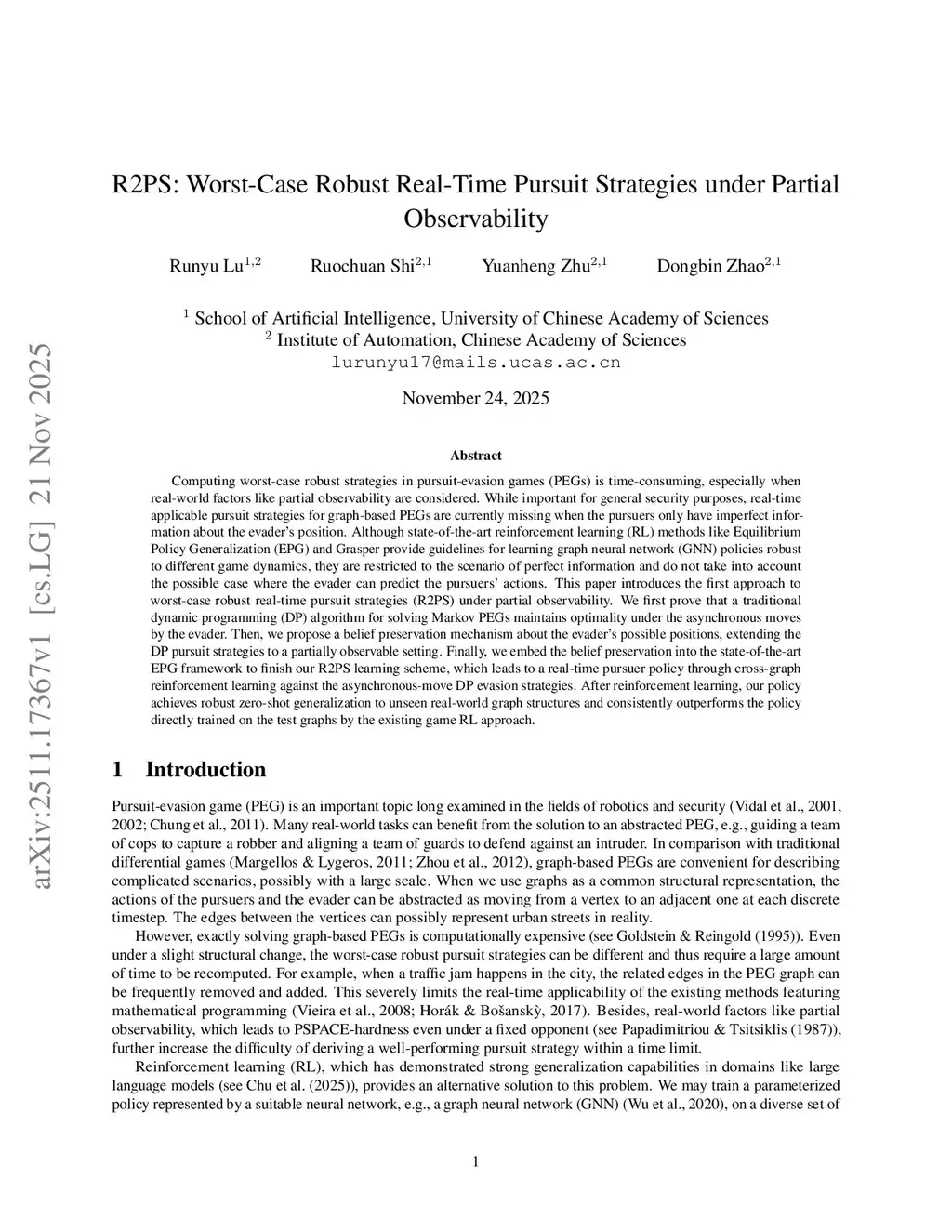 Computing worst-case robust strategies in pursuit-evasion games (PEGs) is time-consuming, especially when real-world factors like partial observability are considered. While important for general security purposes, real-time applicable pursuit strategies for graph-based PEGs are currently missing when the pursuers only have imperfect information about the evader's position. Although state-of-the-art reinforcement learning (RL) methods like Equilibrium Policy Generalization (EPG) and Grasper provide guidelines for learning graph neural network (GNN) policies robust to different game dynamics, they are restricted to the scenario of perfect information and do not take into account the possible case where the evader can predict the pursuers' actions. This paper introduces the first approach to worst-case robust real-time pursuit strategies (R2PS) under partial observability. We first prove that a traditional dynamic programming (DP) algorithm for solving Markov PEGs maintains optimality under the asynchronous moves by the evader. Then, we propose a belief preservation mechanism about the evader's possible positions, extending the DP pursuit strategies to a partially observable setting. Finally, we embed the belief preservation into the state-of-the-art EPG framework to finish our R2PS learning scheme, which leads to a real-time pursuer policy through cross-graph reinforcement learning against the asynchronous-move DP evasion strategies. After reinforcement learning, our policy achieves robust zero-shot generalization to unseen real-world graph structures and consistently outperforms the policy directly trained on the test graphs by the existing game RL approach.
