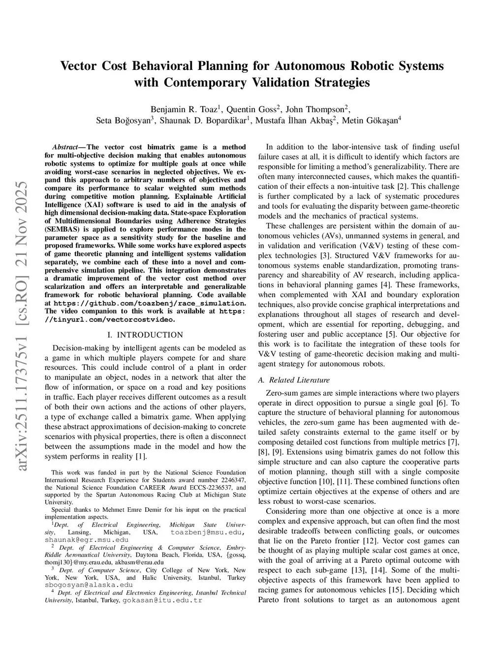 Vector Cost Behavioral Planning for Autonomous Robotic Systems with Contemporary Validation Strategies