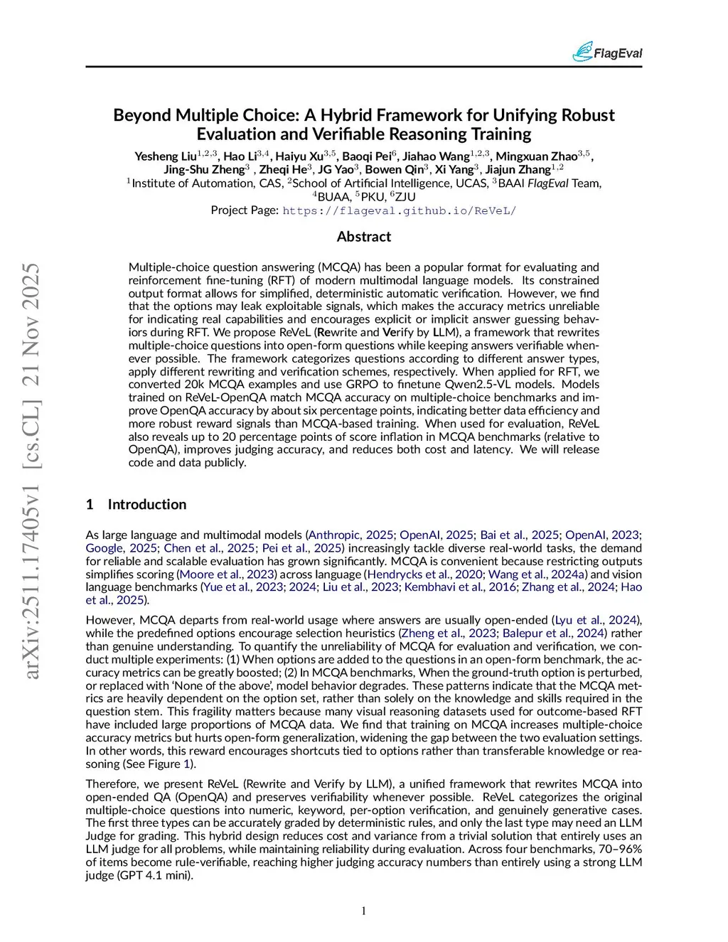 Multiple-choice question answering (MCQA) has been a popular format for evaluating and reinforcement fine-tuning (RFT) of modern multimodal language models. Its constrained output format allows for simplified, deterministic automatic verification. However, we find that the options may leak exploitable signals, which makes the accuracy metrics unreliable for indicating real capabilities and encourages explicit or implicit answer guessing behaviors during RFT. We propose ReVeL (Rewrite and Verify by LLM), a framework that rewrites multiple-choice questions into open-form questions while keeping answers verifiable whenever possible. The framework categorizes questions according to different answer types, apply different rewriting and verification schemes, respectively. When applied for RFT, we converted 20k MCQA examples and use GRPO to finetune Qwen2.5-VL models. Models trained on ReVeL-OpenQA match MCQA accuracy on multiple-choice benchmarks and improve OpenQA accuracy by about six percentage points, indicating better data efficiency and more robust reward signals than MCQA-based training. When used for evaluation, ReVeL also reveals up to 20 percentage points of score inflation in MCQA benchmarks (relative to OpenQA), improves judging accuracy, and reduces both cost and latency. We will release code and data publicly.