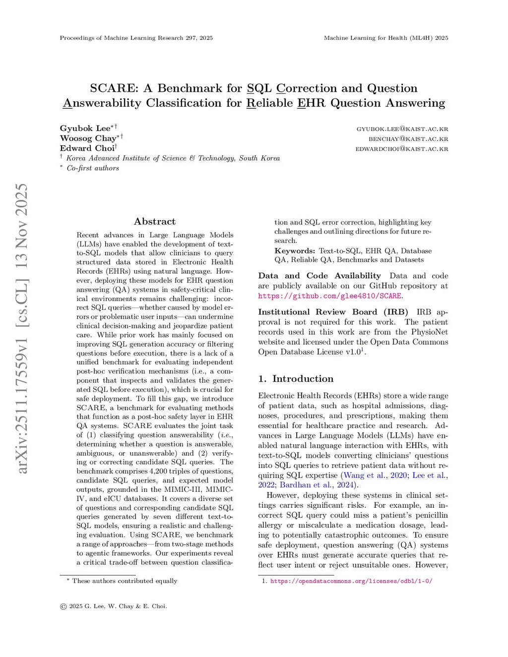 SCARE: A Benchmark for SQL Correction and Question Answerability Classification for Reliable EHR Question Answering