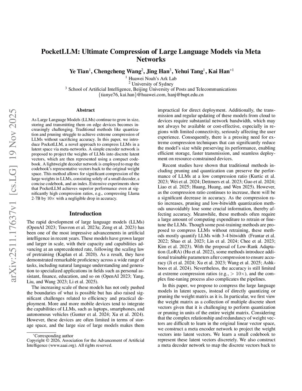 As Large Language Models (LLMs) continue to grow in size, storing and transmitting them on edge devices becomes increasingly challenging. Traditional methods like quantization and pruning struggle to achieve extreme compression of LLMs without sacrificing accuracy. In this paper, we introduce PocketLLM, a novel approach to compress LLMs in a latent space via meta-networks. A simple encoder network is proposed to project the weights of LLMs into discrete latent vectors, which are then represented using a compact codebook. A lightweight decoder network is employed to map the codebook's representative vectors back to the original weight space. This method allows for significant compression of the large weights in LLMs, consisting solely of a small decoder, a concise codebook, and an index. Extensive experiments show that PocketLLM achieves superior performance even at significantly high compression ratios, e.g., compressing Llama 2-7B by 10x with a negligible drop in accuracy.